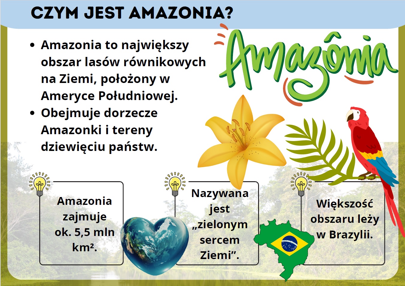 Amazonia – zielone serce Ziemi! Dlaczego los jednego lasu wpływa na klimat całego świata? Nasza gazetka szkolna o Amazonii w przystępny i atrakcyjny sposób wyjaśnia jej ogromne znaczenie dla klimatu, pogody i życia na Ziemi.