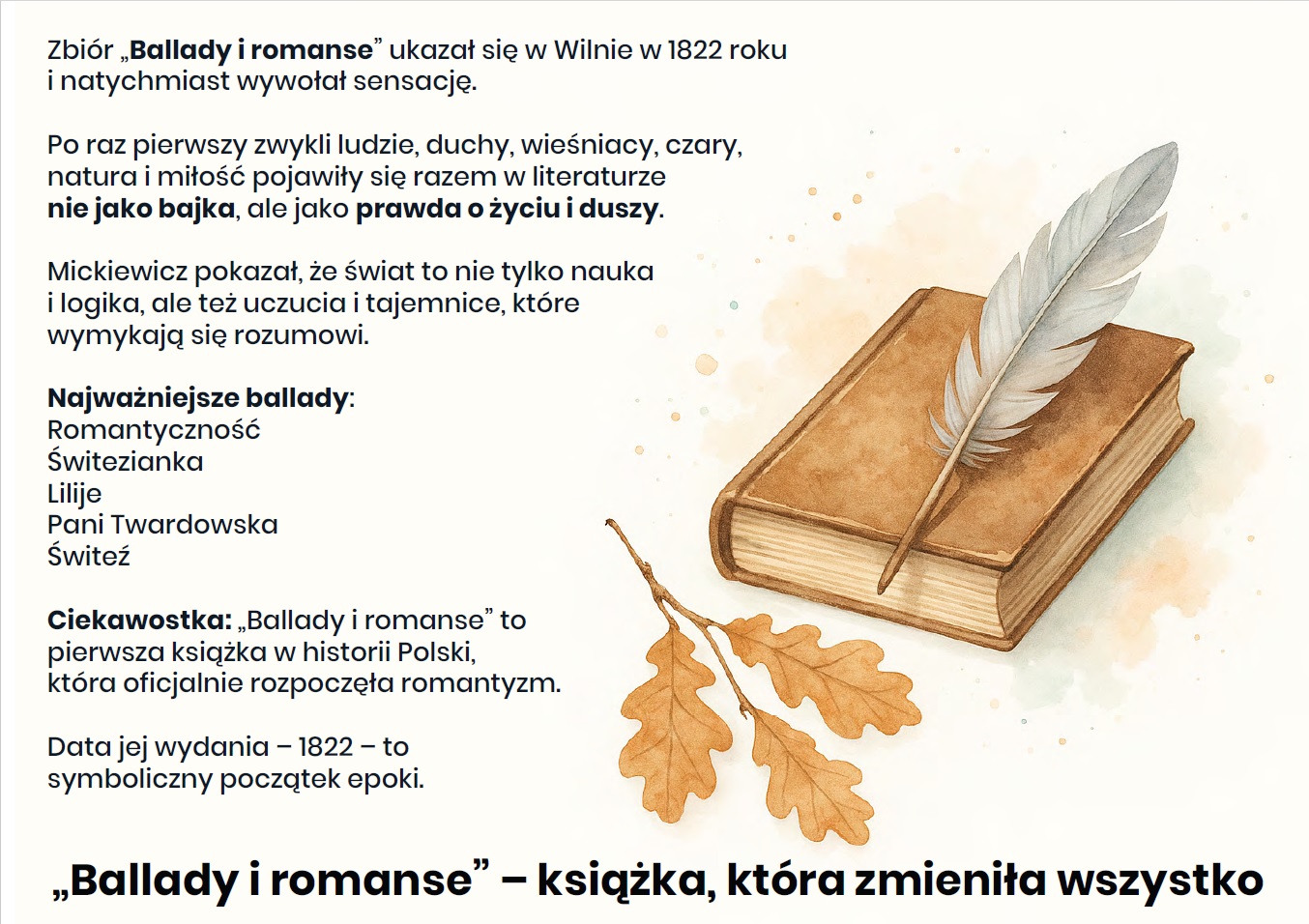 To właśnie ten zbiór sprawił, że romantyzm stał się w Polsce odrębnym i silnym nurtem literackim. Zmienił sposób myślenia o poezji, bohaterach i świecie przedstawionym.