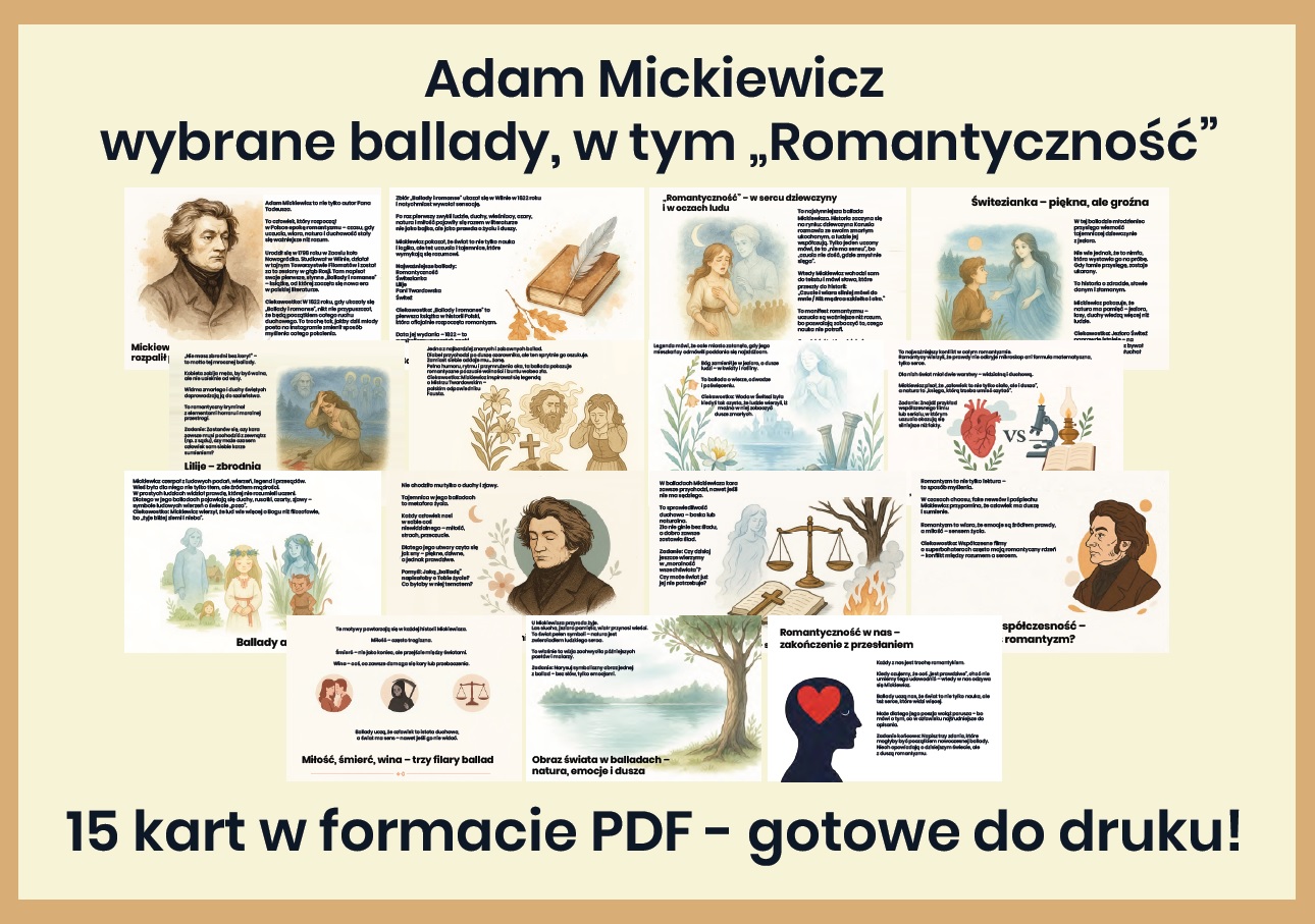 Nasza gazetka została stworzona tak, aby nauczyciel mógł oszczędzić czas, a uczniowie – zrozumieć romantyzm w sposób ciekawy, prosty i angażujący. To znakomite uzupełnienie lekcji, dekoracji sali lub dodatkowego materiału edukacyjnego. 📚✨ Z tą gazetką poznawanie Mickiewicza staje się prawdziwą literacką przygodą! 🌲🕯️💕
