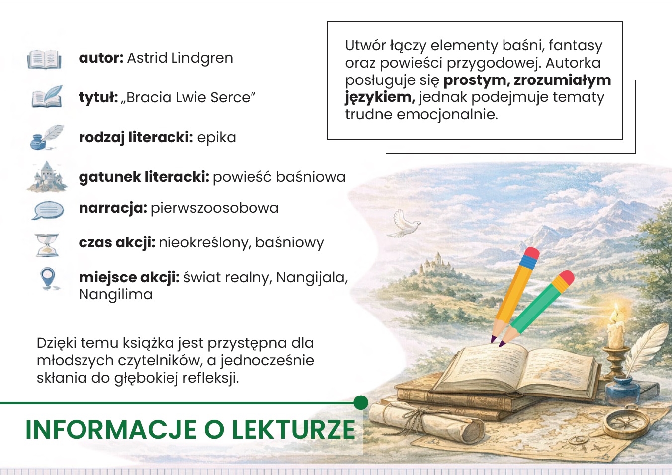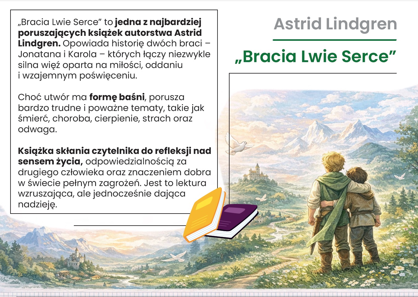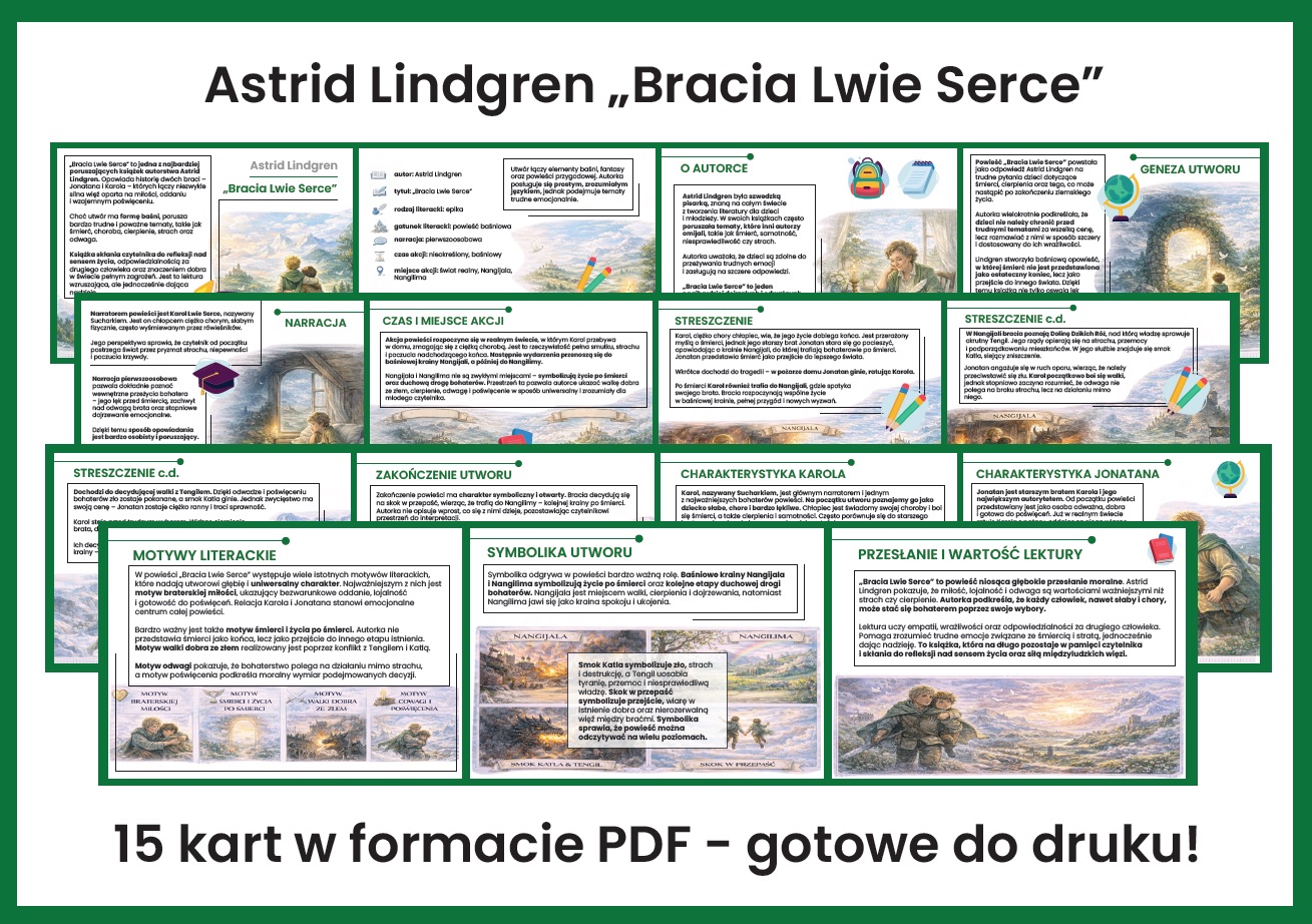 Zapraszamy do wyjątkowej gazetki szkolnej poświęconej lekturze Bracia Lwie Serce! 📖 Nasza gazetka składa się z aż 15 kart PDF, które w przystępny i atrakcyjny sposób przybliżają uczniom historię braterskiej miłości, odwagi oraz walki dobra ze złem.