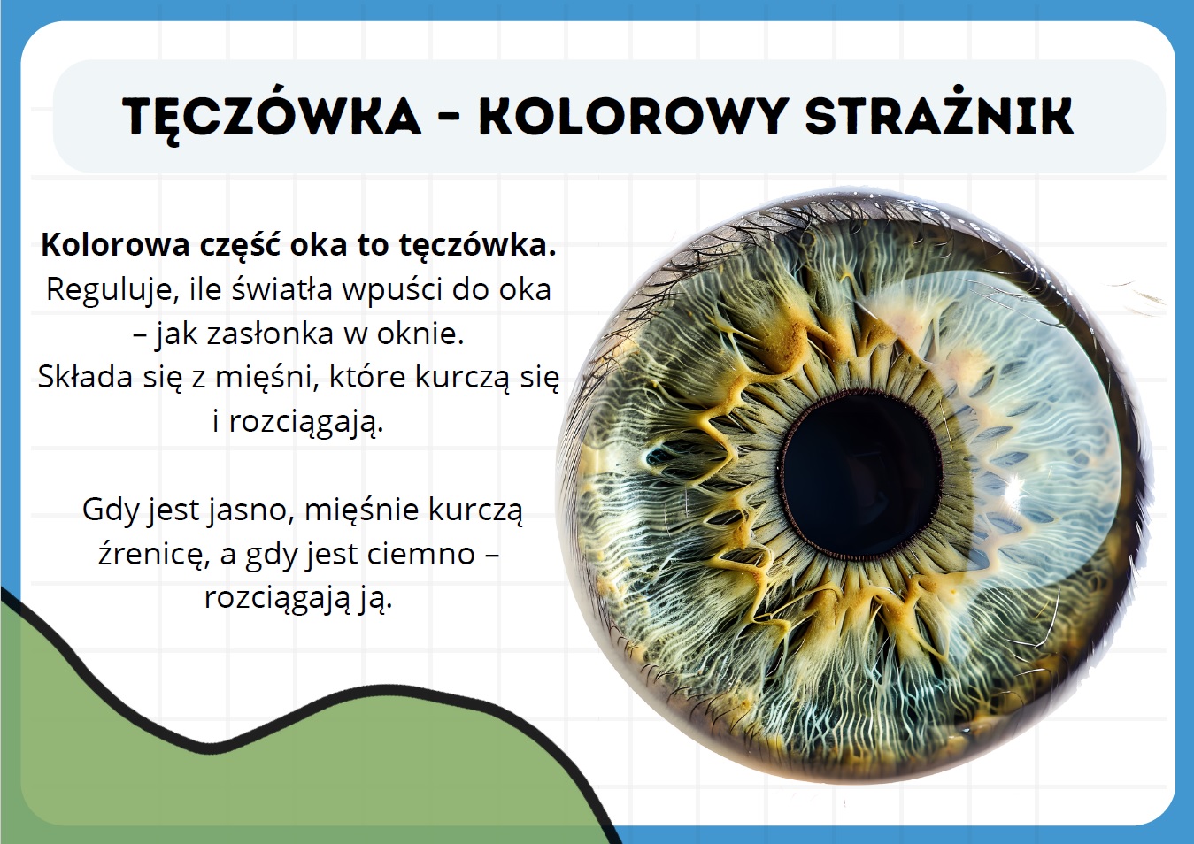 - Tęczówka – kolorowa część oka, reguluje ilość światła wpadającego do środka poprzez zmianę średnicy źrenicy.