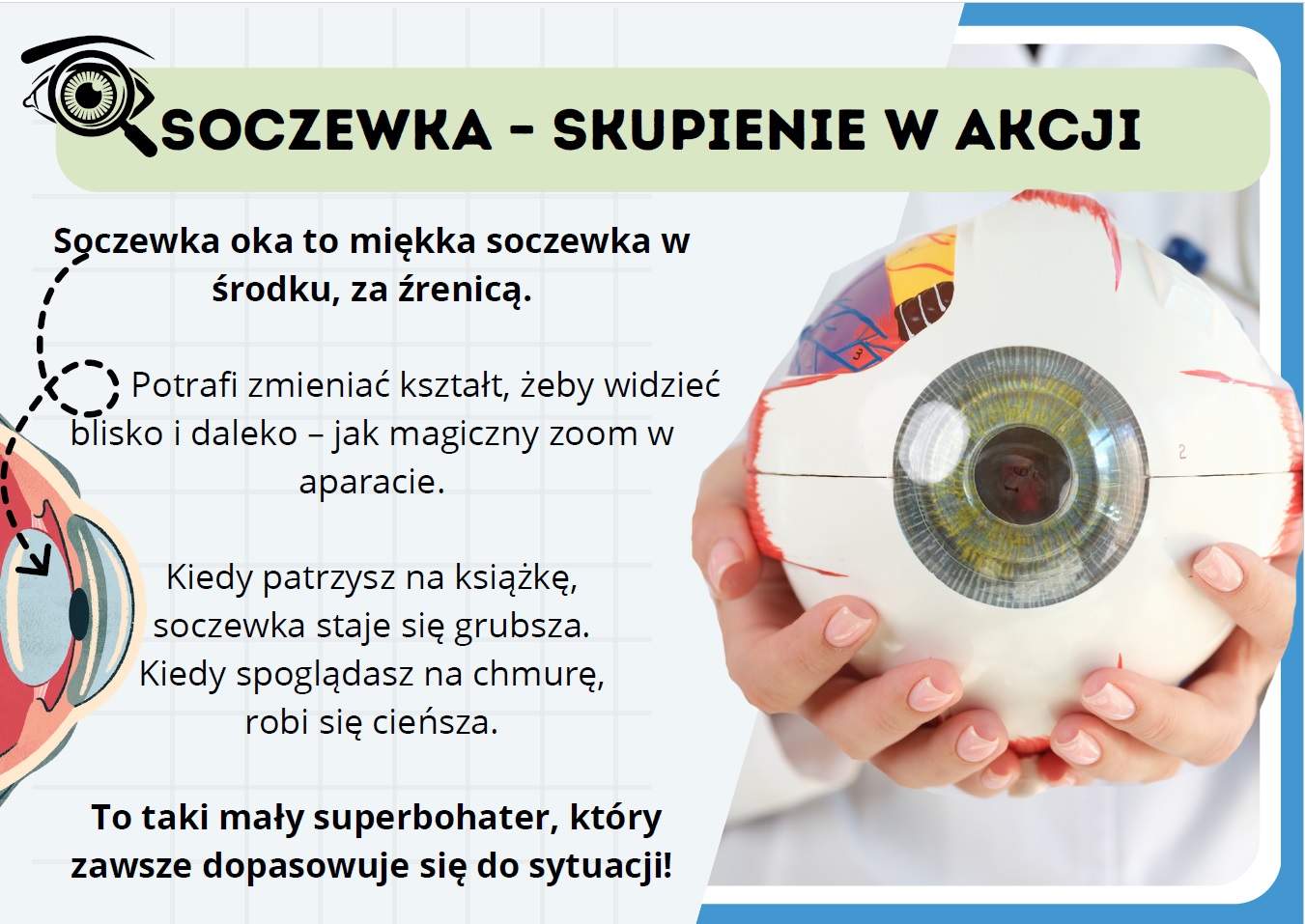 - Soczewka – przezroczysty element, który zmienia swój kształt (akomodacja), by ostro ustawiać obraz bliskich i dalekich przedmiotów na siatkówce.