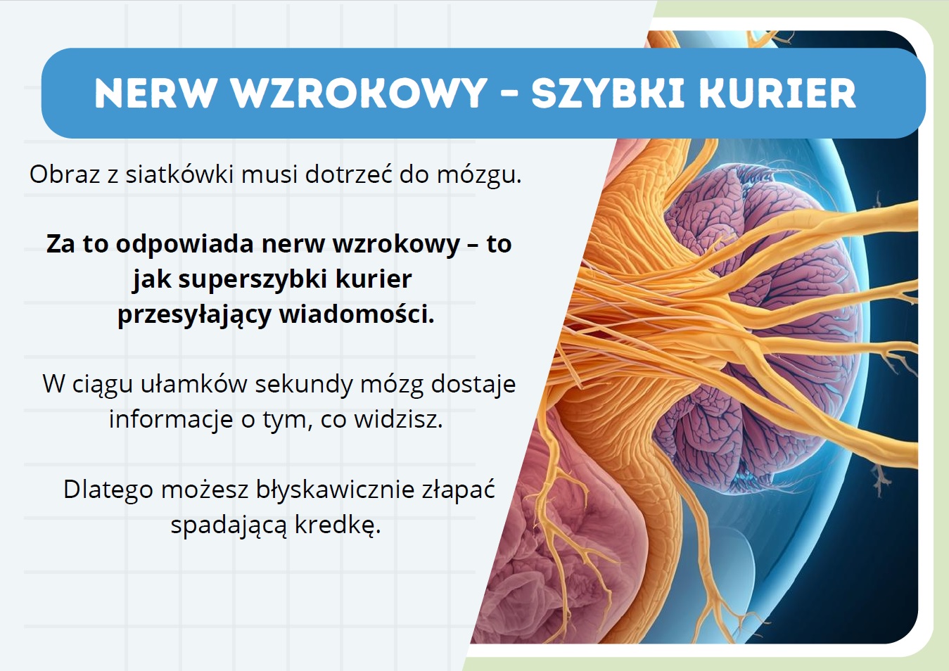 - Nerw wzrokowy – przewodzi impulsy elektryczne z siatkówki do mózgu.