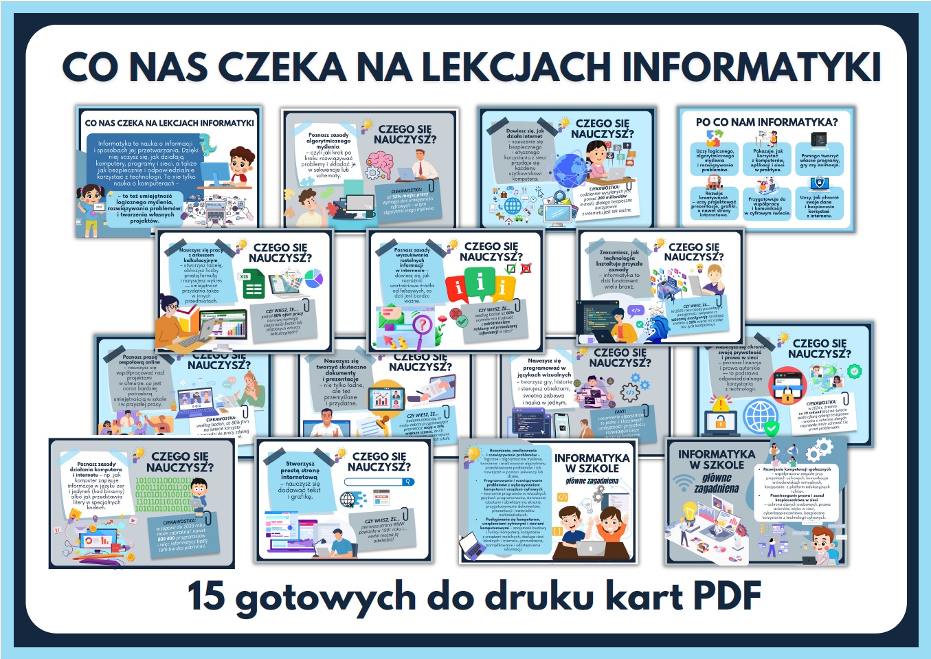 📌 Co czeka uczniów na lekcjach informatyki? 📌 Przygotowaliśmy wyjątkową gazetkę szkolną zatytułowaną „Co nas czeka na lekcjach informatyki?” 🖥️. To aż 15 kolorowych kart w formacie PDF, a każda z nich prezentuje najważniejsze i kluczowe zagadnienia, które uczniowie będą poznawać podczas lekcji.