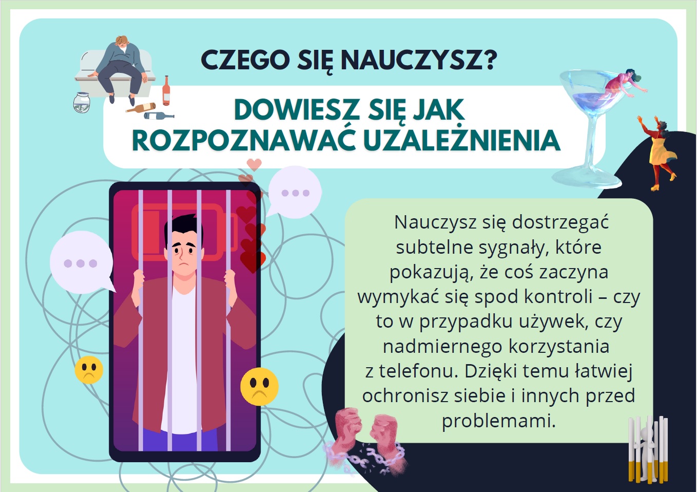 - Kształtowanie umiejętności – np. radzenia sobie ze stresem, rozpoznawania emocji, podejmowania odpowiedzialnych decyzji, dbania o bezpieczeństwo własne i innych.
