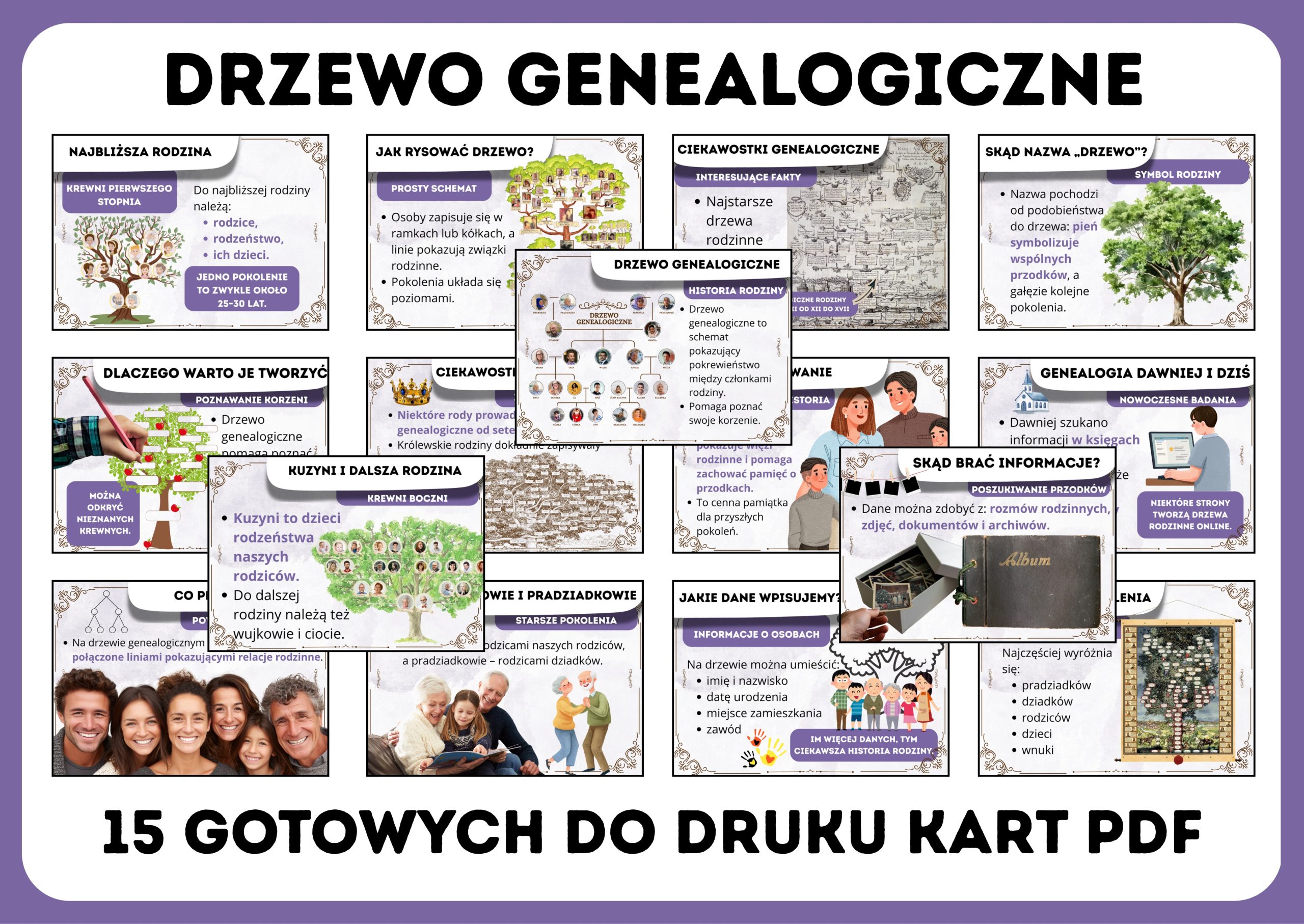 Przygotuj atrakcyjną gazetkę szkolną o drzewie genealogicznym i pomóż uczniom lepiej zrozumieć, czym są więzi rodzinne oraz jak przedstawiać historię swojej rodziny! Zestaw zawiera aż 15 kart PDF, które w przejrzysty i ciekawy sposób wyjaśniają, czym jest drzewo genealogiczne, jak je tworzyć oraz jakie informacje można w nim umieścić.