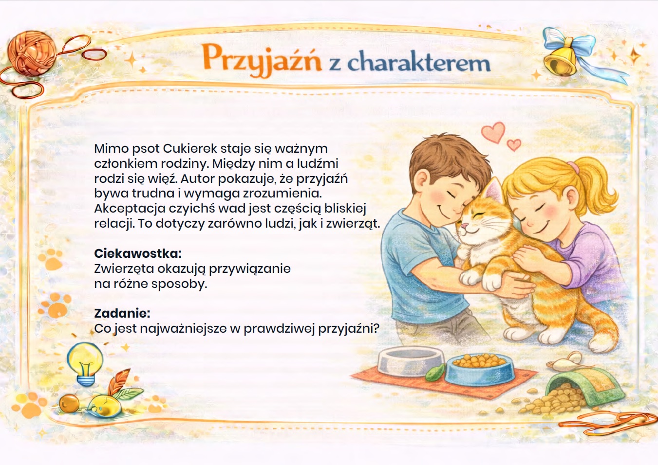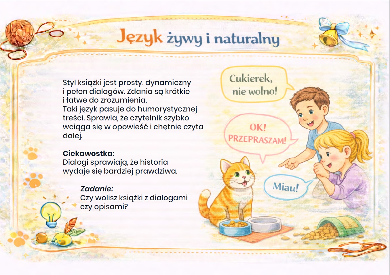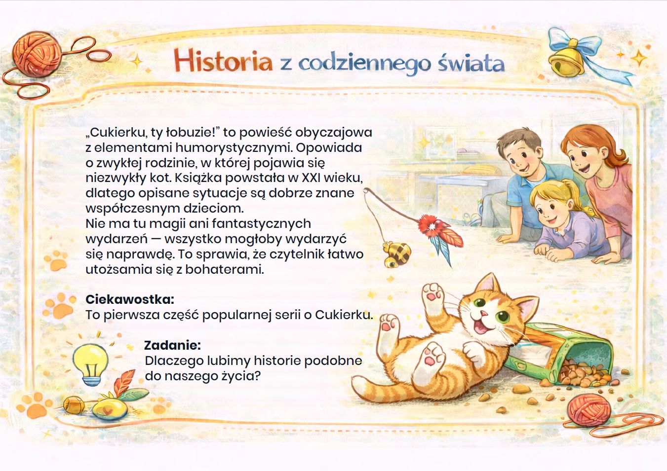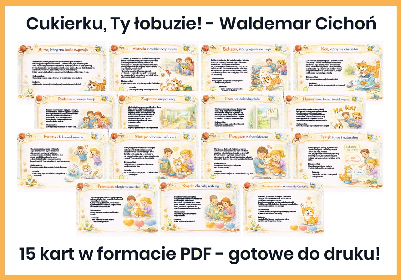 Nasza gazetka szkolna o książce Cukierku, ty łobuzie! autorstwa Waldemar Cichoń! to aż 15 kart PDF do druku! Ta barwna gazetka szkolna w atrakcyjnej formie przybliża uczniom perypetie niesfornego kota Cukierka, który potrafi rozbawić do łez i zaskoczyć na każdej stronie.