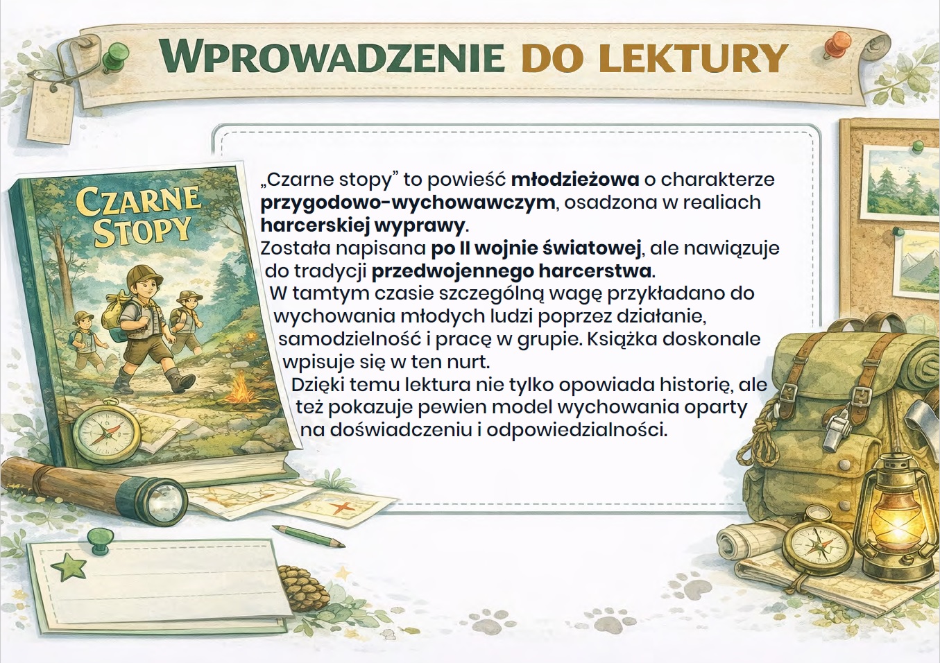 Pobierz naszą edukacyjną gazetkę szkolną poświęconą lekturze Czarne stopy Seweryny Szmaglewskiej. To atrakcyjny zestaw aż 15 kart PDF, który w przystępny i angażujący sposób przybliża uczniom treść książki, jej bohaterów oraz harcerski klimat wakacyjnych przygód.