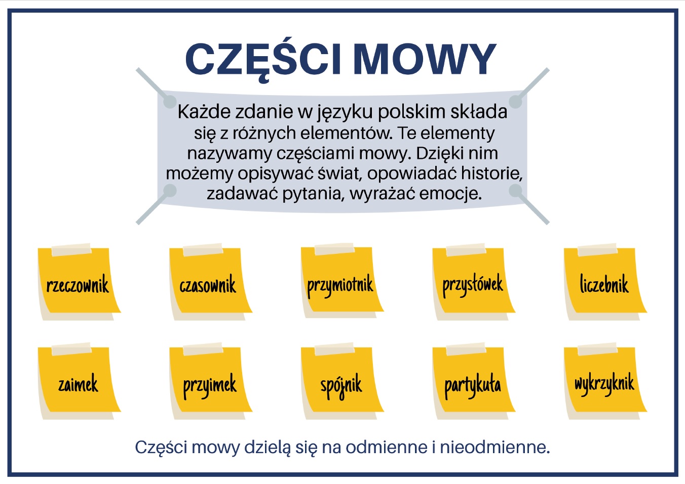 W języku polskim części mowy dzielimy na odmienne (czyli takie, które zmieniają swoją formę) oraz nieodmienne.