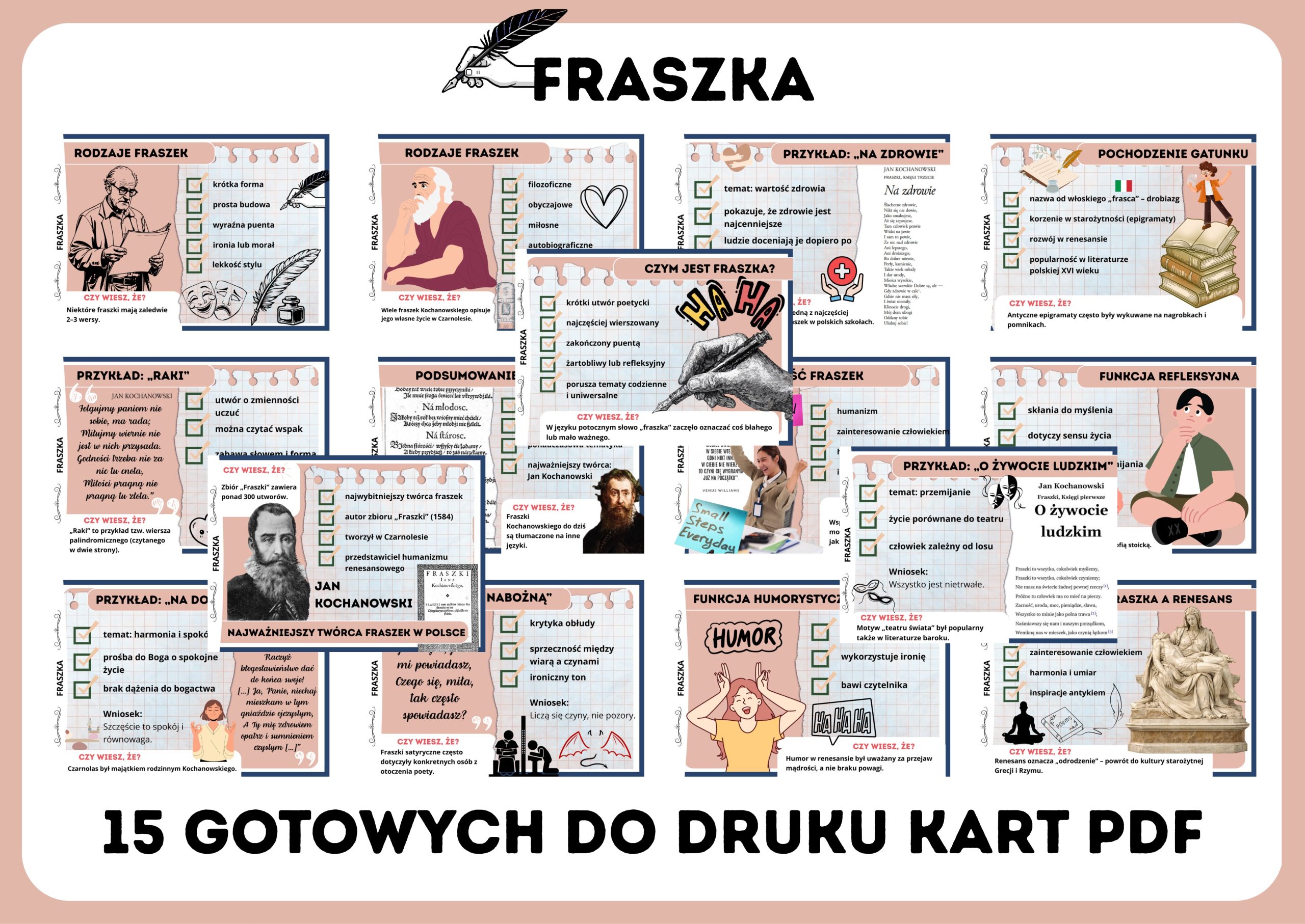 Przedstawiam wyjątkową edukacyjną gazetkę szkolną poświęconą fraszce – krótkiej, ale niezwykle treściwej formie literackiej! To aż 15 estetycznych kart PDF, które w przystępny i atrakcyjny sposób przybliżą uczniom cechy fraszki, jej historię oraz twórczość najwybitniejszych autorów.