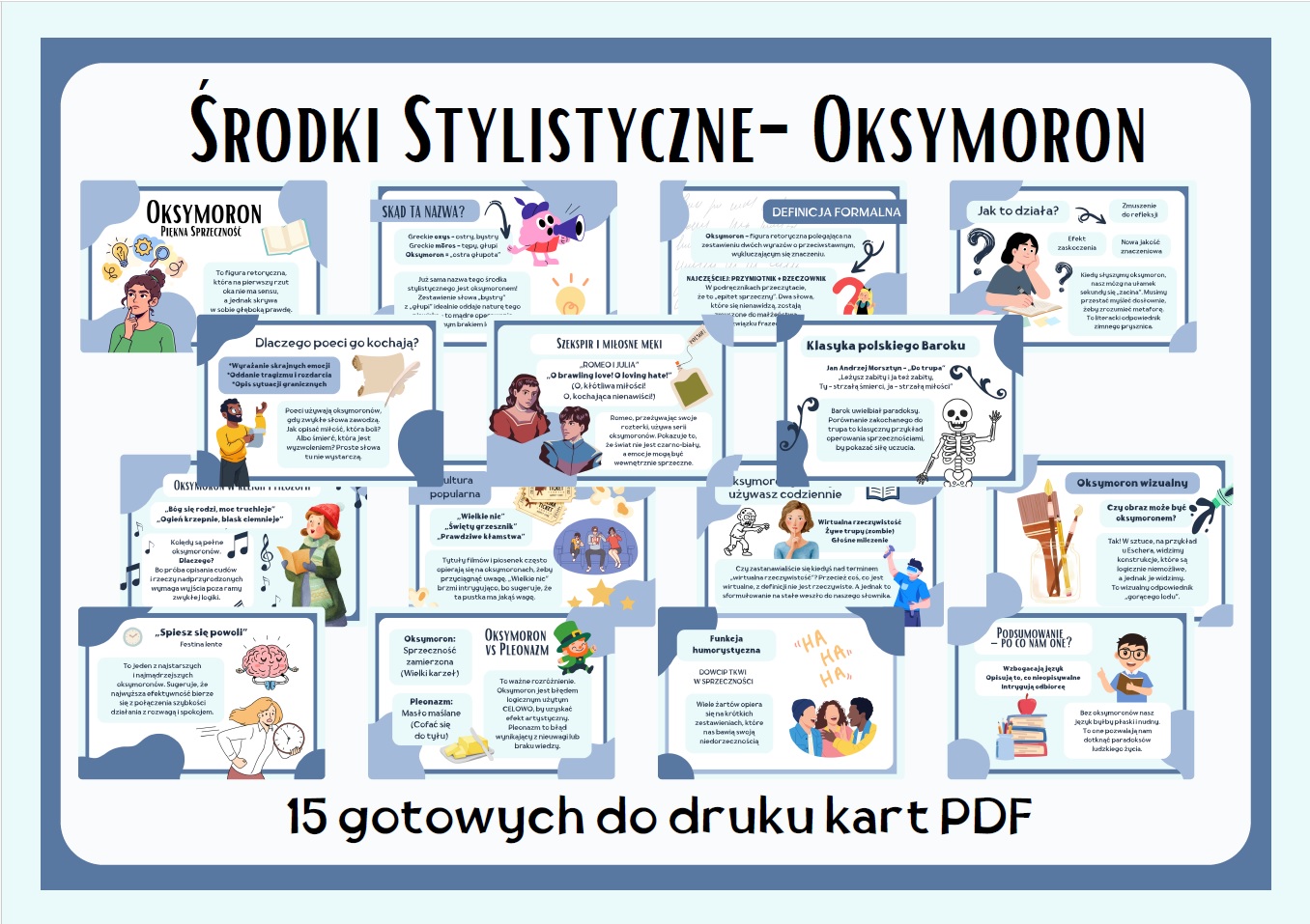 Przygotuj ciekawą i estetyczną gazetkę szkolną o oksymoronie, która w prosty i atrakcyjny sposób wyjaśnia to ważne pojęcie literackie. Mój zestaw zawiera aż 15 kart PDF gotowych do wydruku, dzięki którym stworzysz wartościową dekorację edukacyjną do sali lekcyjnej lub na szkolny korytarz.