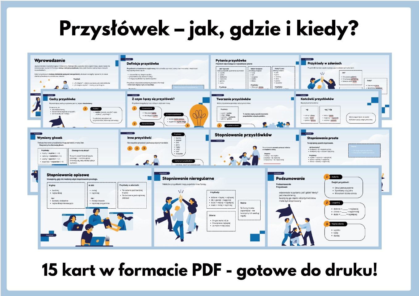 Przygotuj atrakcyjną gazetkę szkolną o przysłówku i pomóż uczniom lepiej zrozumieć jedną z ważnych części mowy! Zestaw zawiera aż 15 kart PDF, które w przejrzysty i ciekawy sposób wyjaśniają, czym jest przysłówek, na jakie pytania odpowiada oraz jak rozpoznawać go w zdaniach.