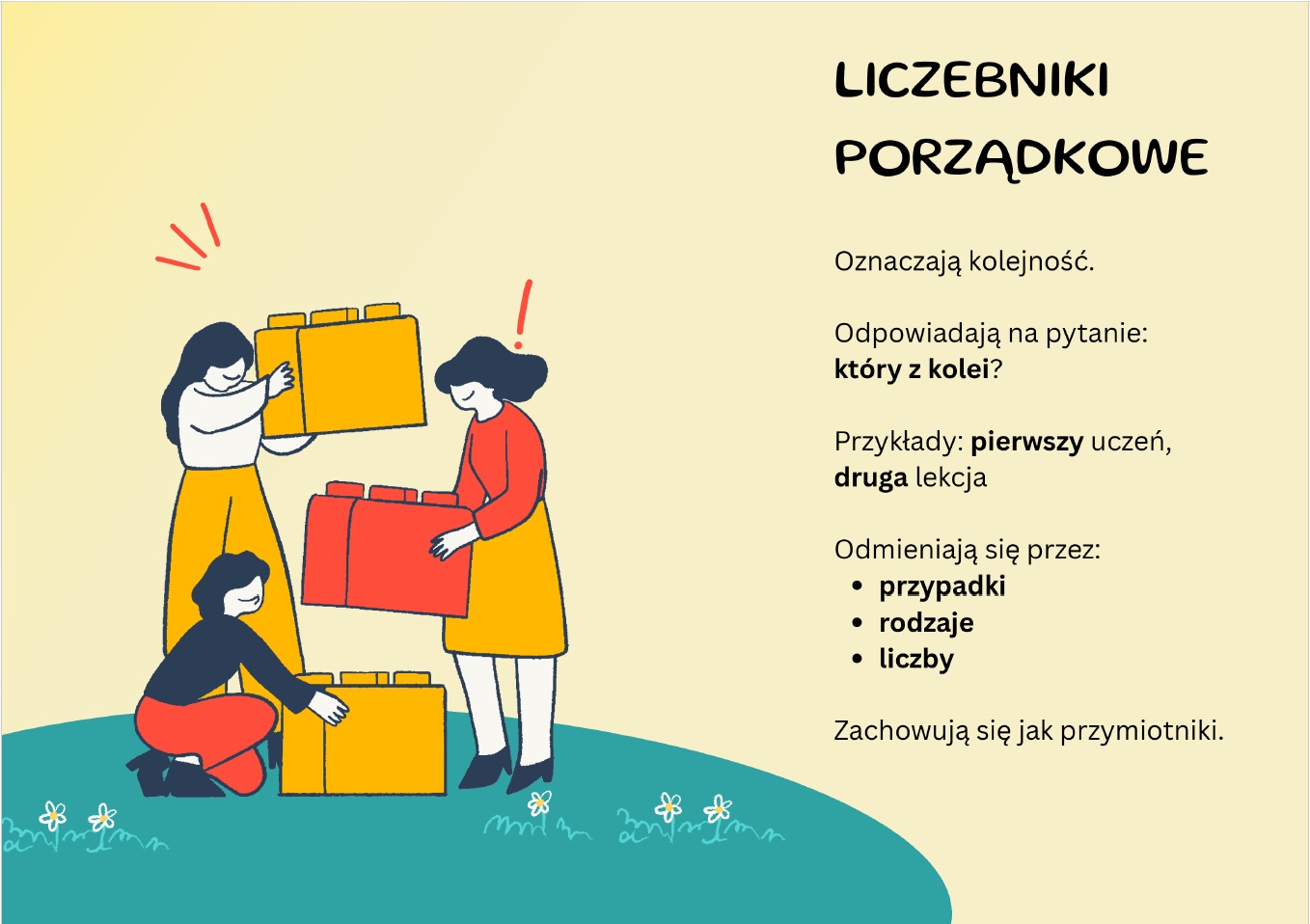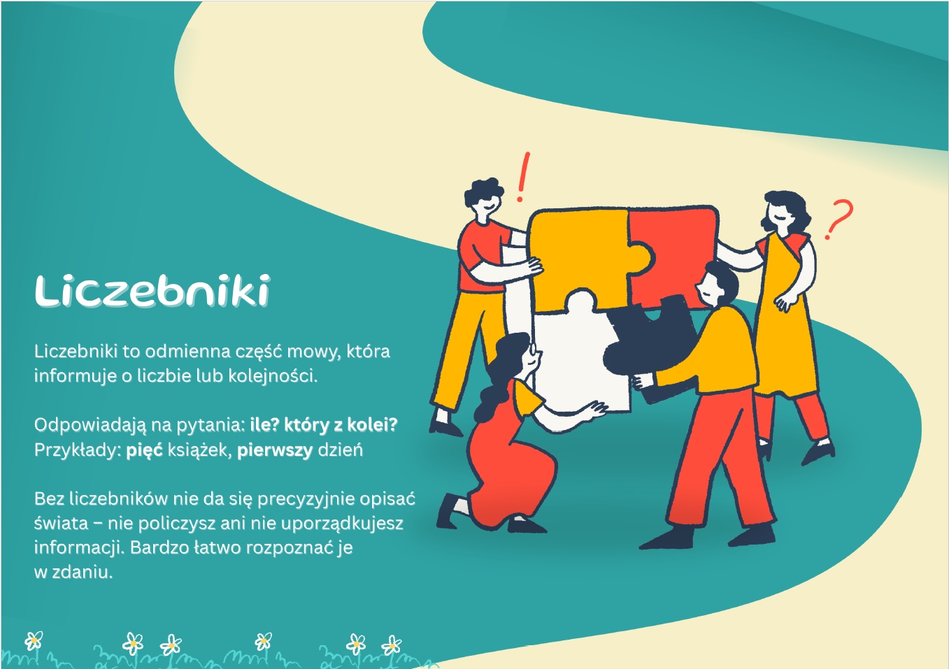 Liczebniki to część mowy, która określa liczbę, ilość, kolejność albo wielokrotność osób, zwierząt, rzeczy czy zjawisk. Odpowiadają na pytania: ile? który z kolei? ile razy?