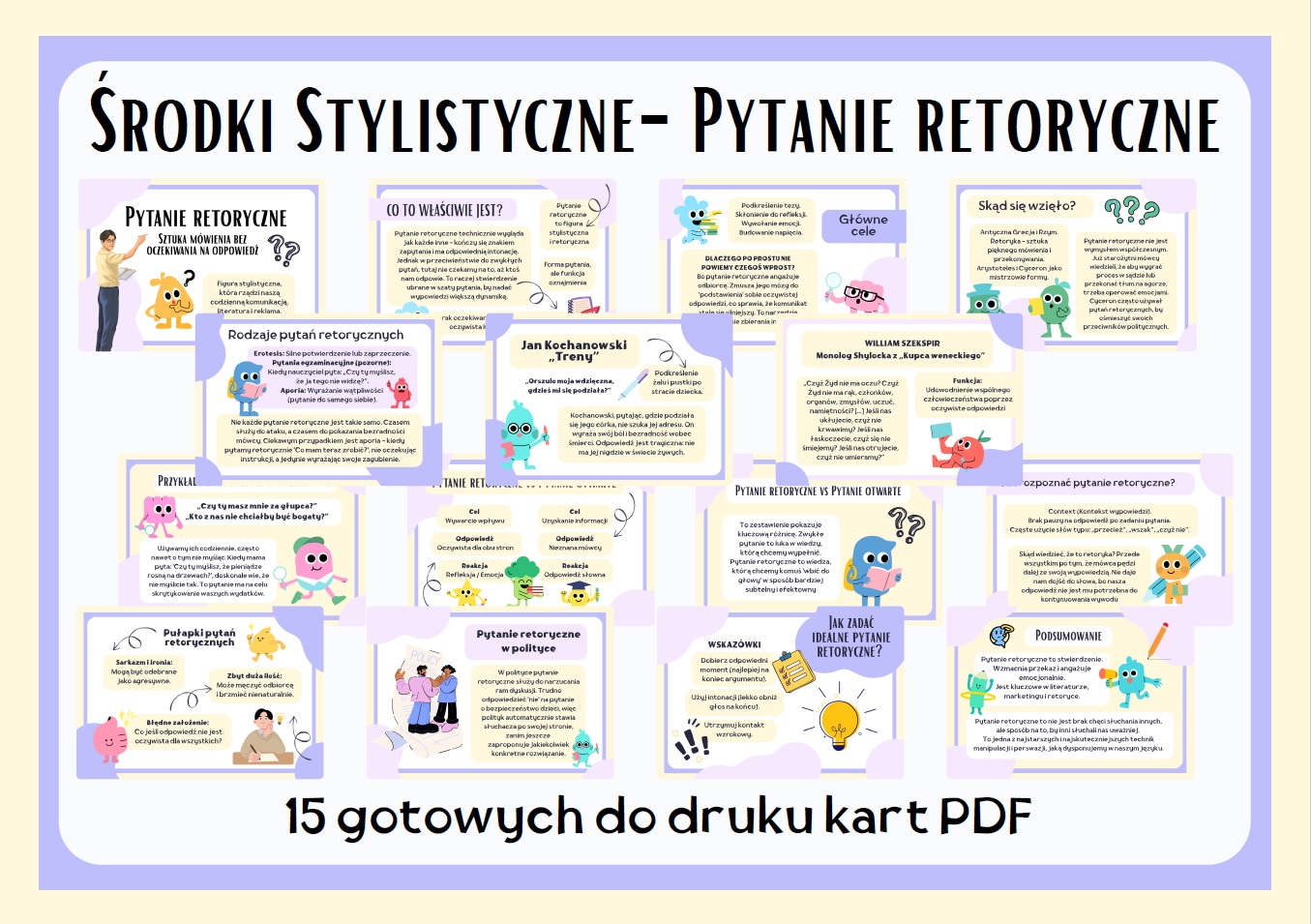 Przygotuj ciekawą gazetkę szkolną o pytaniach retorycznych i pomóż uczniom lepiej zrozumieć ten ważny środek stylistyczny! Zestaw zawiera aż 15 kart PDF, które w atrakcyjny i przejrzysty sposób wyjaśniają, czym jest pytanie retoryczne, kiedy się je stosuje oraz jakie pełni funkcje w wypowiedzi.