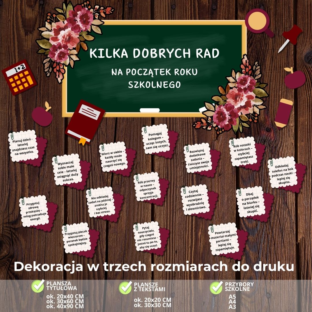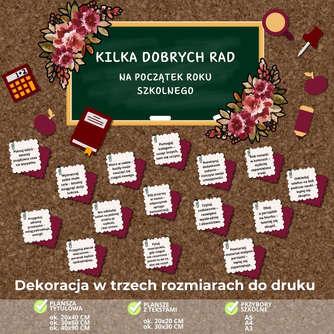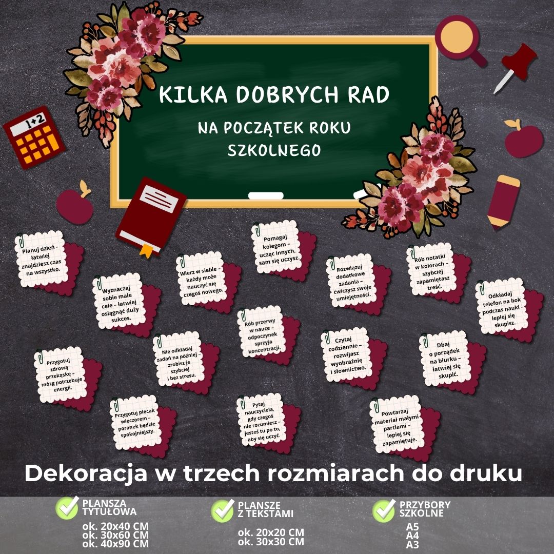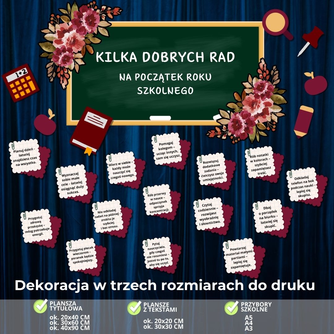 To nasza najnowsza dekoracja na rozpoczęcie roku szkolnego ✨ Przywitaj uczniów w pięknie udekorowanej sali lub na korytarzu! Nasz zestaw dekoracji został przygotowany tak, abyście mogli stworzyć zarówno mniejszą gazetkę, jak i dużą, efektowną aranżację – dopasowaną do Waszych potrzeb i przestrzeni.