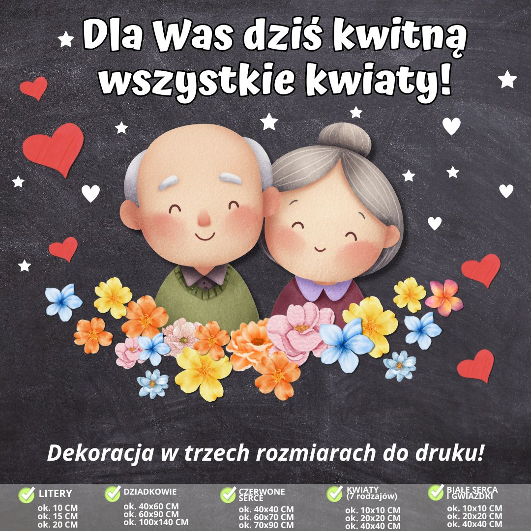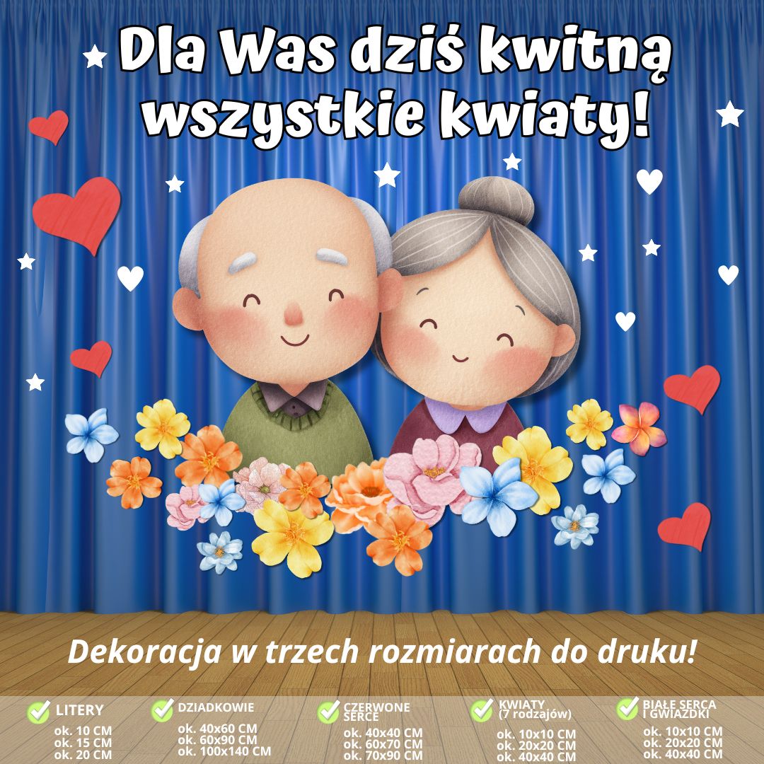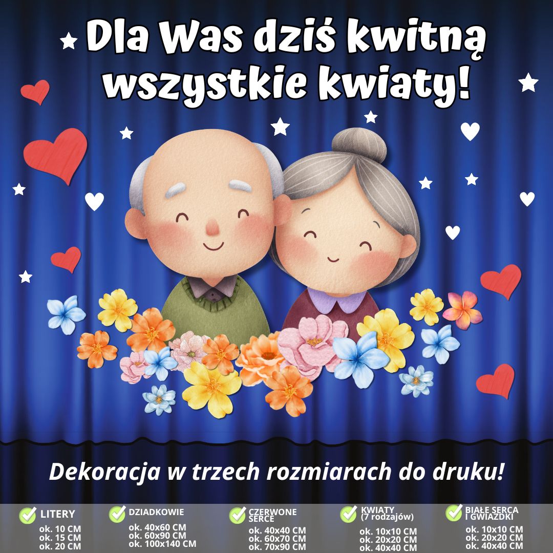 Przesłaniem dekoracji jest radosne świętowanie Dnia Babci i Dziadka oraz podkreślenie więzi między pokoleniami. Kolorowa grafika z uśmiechniętymi dziadkami, bogatą kompozycją kwiatową oraz sercami idealnie sprawdzi się jako oprawa uroczystości przedszkolnych i szkolnych.