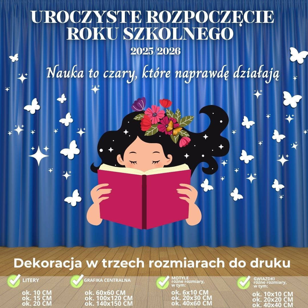 📢Przywitajmy wspólnie nowy rok szkolny! Mam dziś dla Ciebie świetną dekorację na rozpoczęcie roku szkolnego. Dekoracja przedstawia uczennicę czytającą z zaciekawieniem książkę, która przenosi ją w świat magii i czarów, gwiazdki i motylki w różnych wielkościach, duży napis: UROCZYSTE ROZPOCZĘCIE ROKU SZKOLNEGO oraz cytat: Nauka to czary, które naprawdę działają.