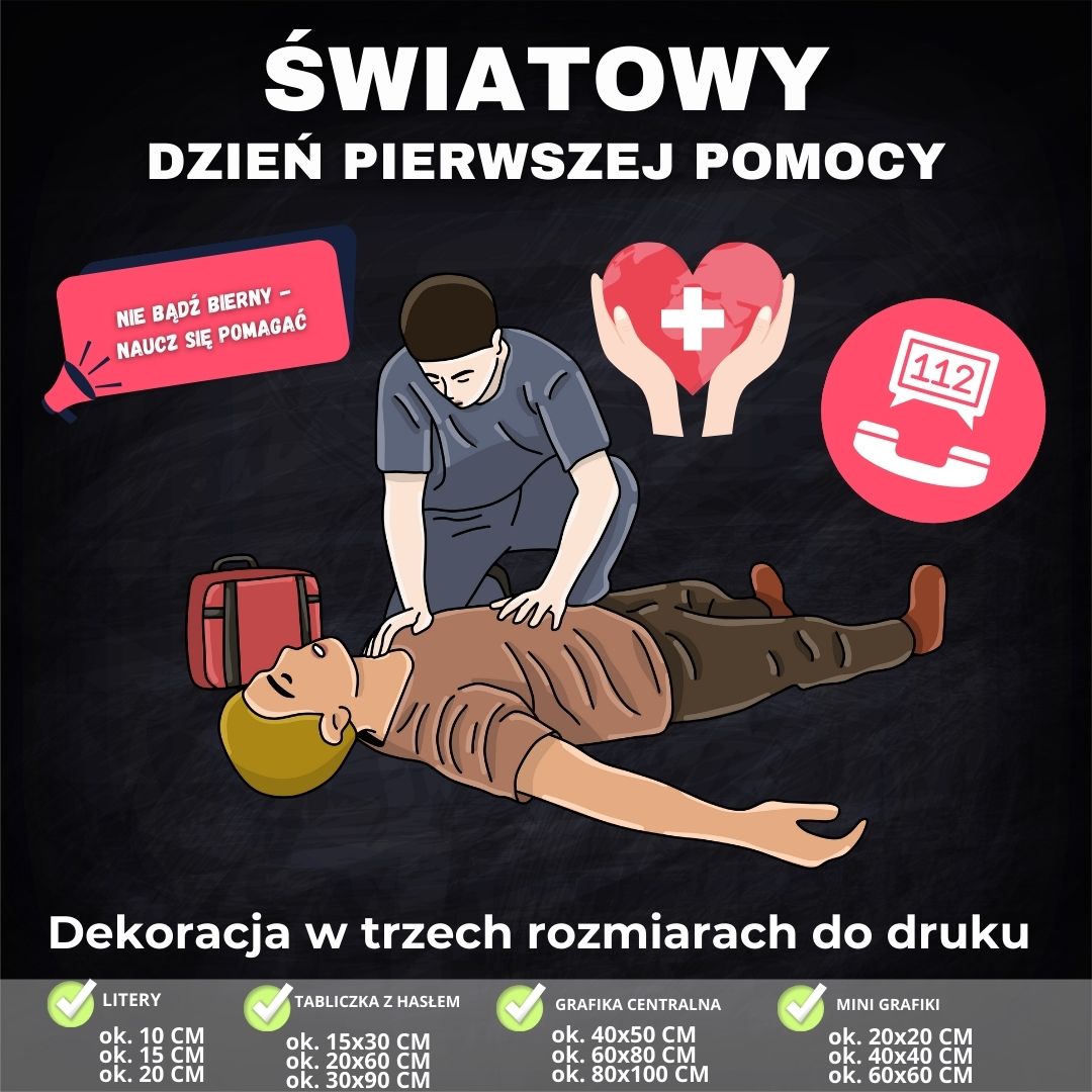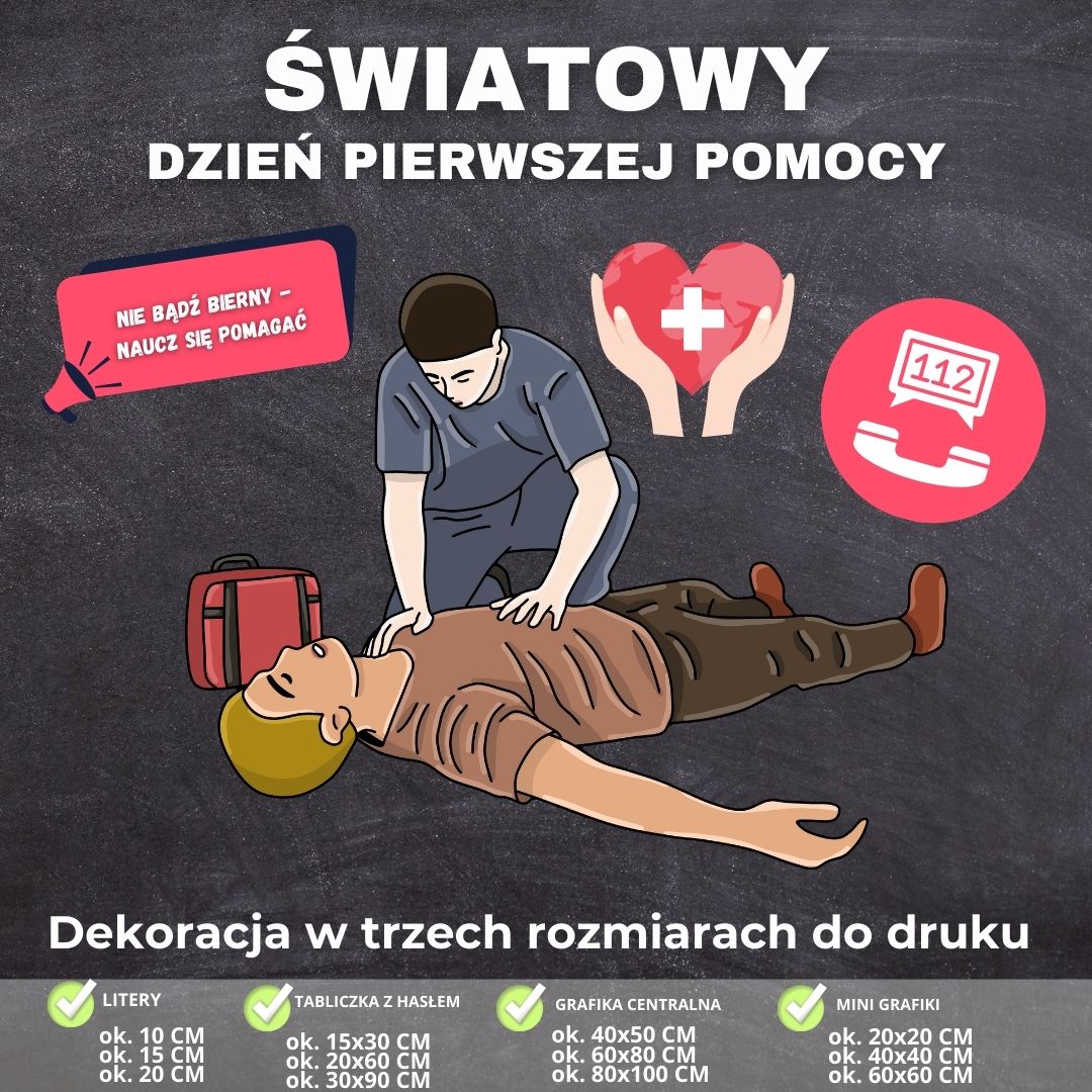 🎉🚑 Stwórz wyjątkową dekorację na Światowy Dzień Pierwszej Pomocy 🚑🎉 Przygotowaliśmy dla Ciebie gotowe do druku elementy dekoracyjne w formacie PDF – idealne na gazetkę ścienną, tablicę lub większą ekspozycję w sali i na korytarzu.