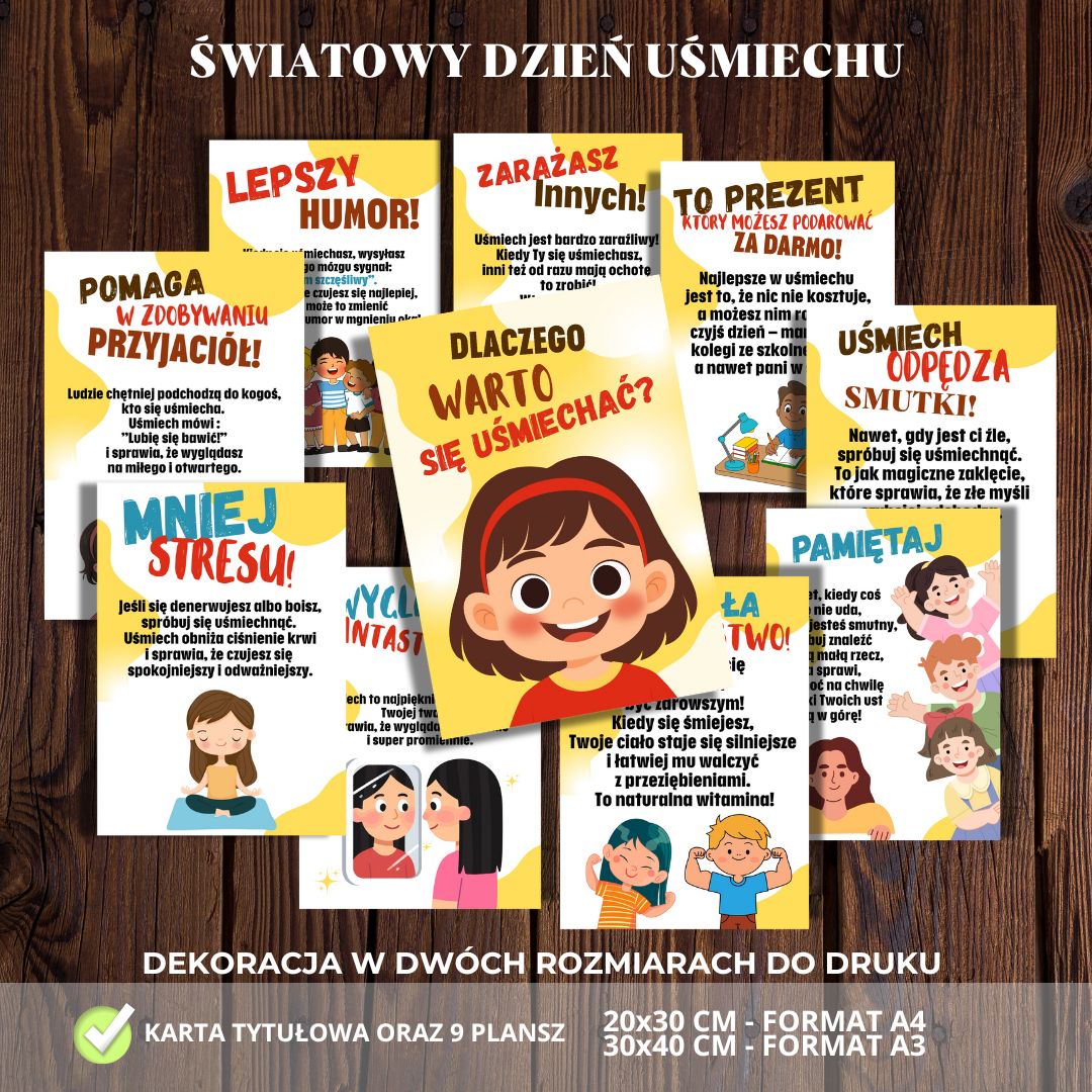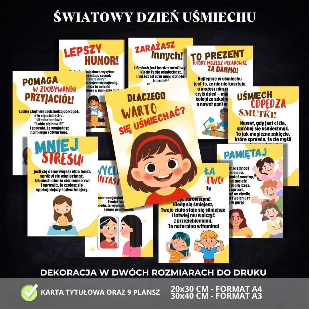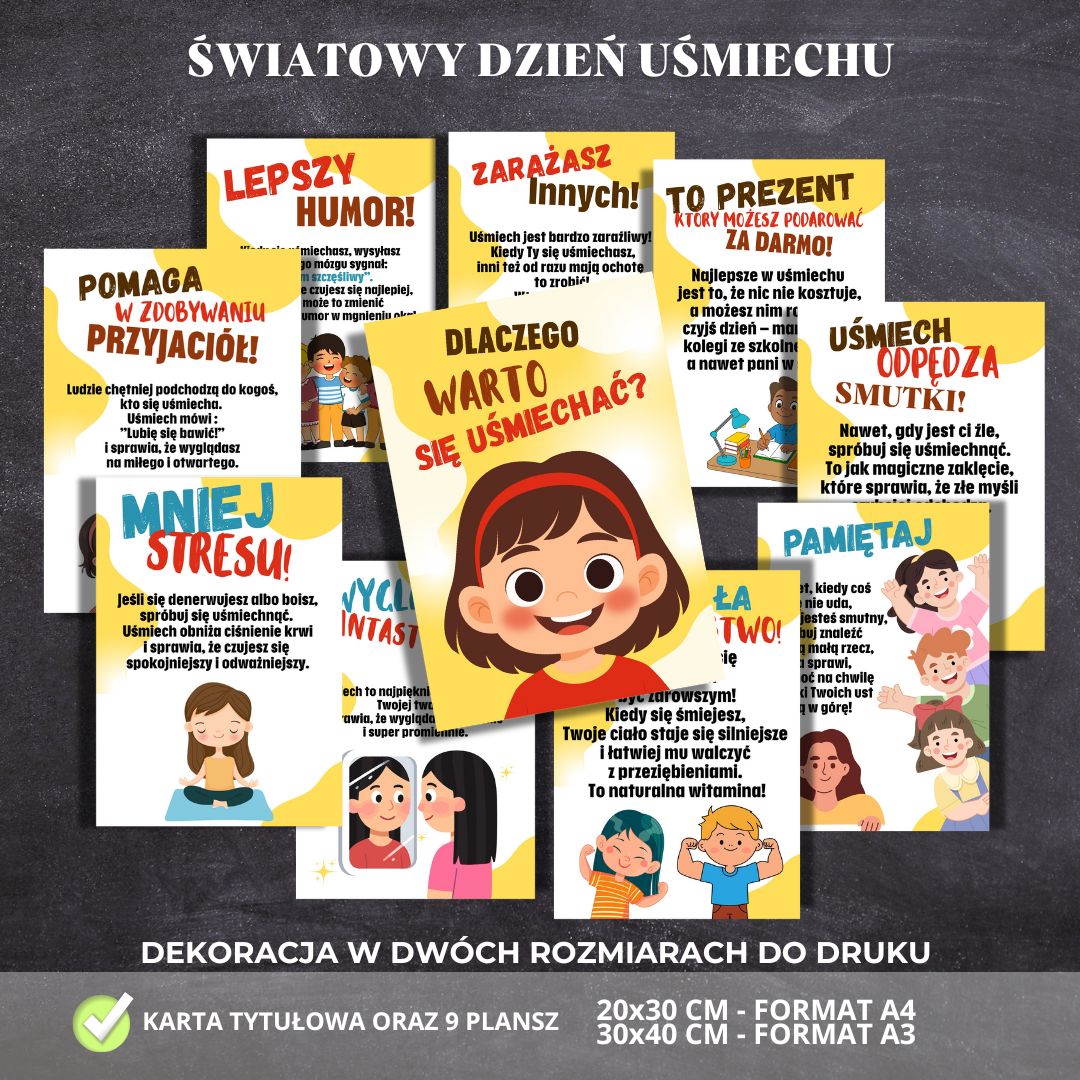 😊 Dekoracja na Światowy Dzień Uśmiechu 😊 Przygotowaliśmy wyjątkowy zestaw edukacyjny, który wprowadzi do Twojej sali lub korytarza szkolnego pozytywną energię i radość. Zestaw składa się z karty tytułowej oraz 9 pięknie ilustrowanych plansz, które pokazują, jak wiele dobrego daje uśmiech – od poprawy nastroju, po budowanie relacji i wzmacnianie zdrowia.