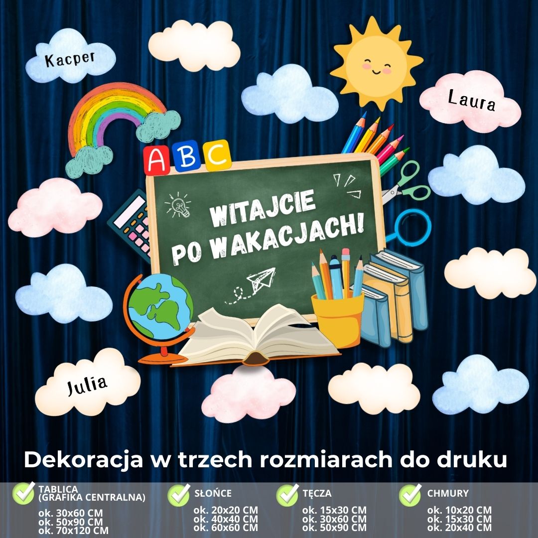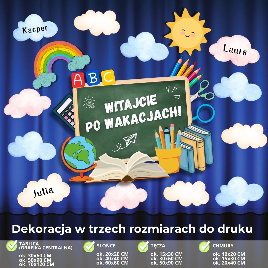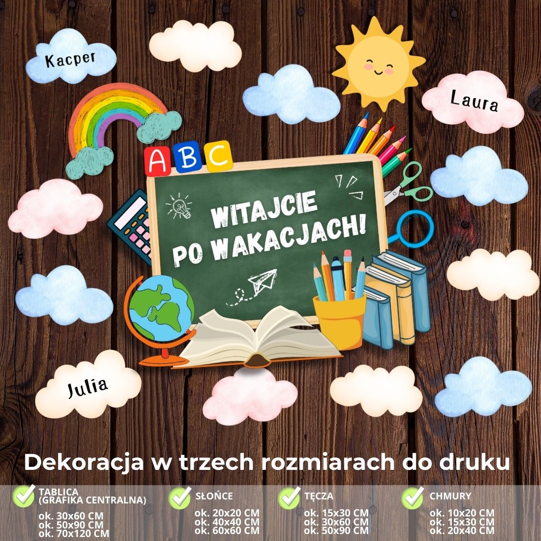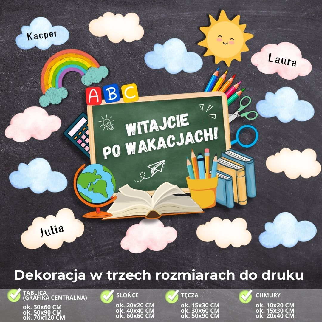 Wszystkie elementy naszej personalizowanej dekoracji na rozpoczęcie roku szkolnego przygotowane są do druku na kartkach formatu A4. Materiały podzielone zostały na trzy zestawy, z których stworzysz zarówno mniejszą gazetkę, jak i większą dekorację (w zależności od potrzeb oraz ilości miejsca, jaką masz do dyspozycji w swojej sali czy na korytarzu szkolnym).