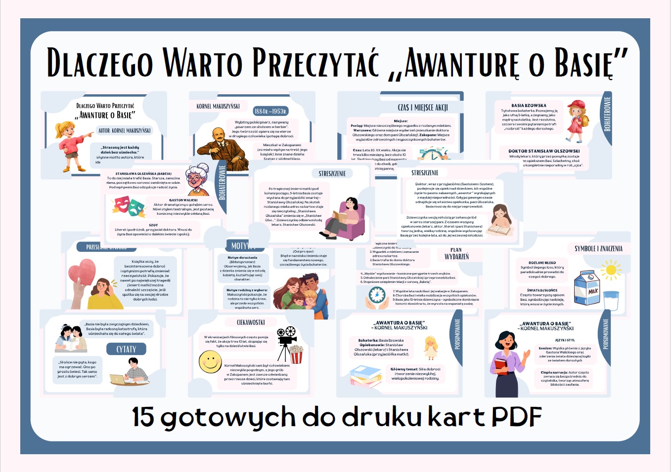 Zadbaj o skuteczne i atrakcyjne omawianie lektury „Awantura o Basię” na lekcji języka polskiego. Ta gazetka szkolna w formacie PDF zawiera aż 15 starannie opracowanych kart, które w czytelny sposób porządkują treść utworu, przedstawiają bohaterów oraz najważniejsze problemy poruszane w książce.