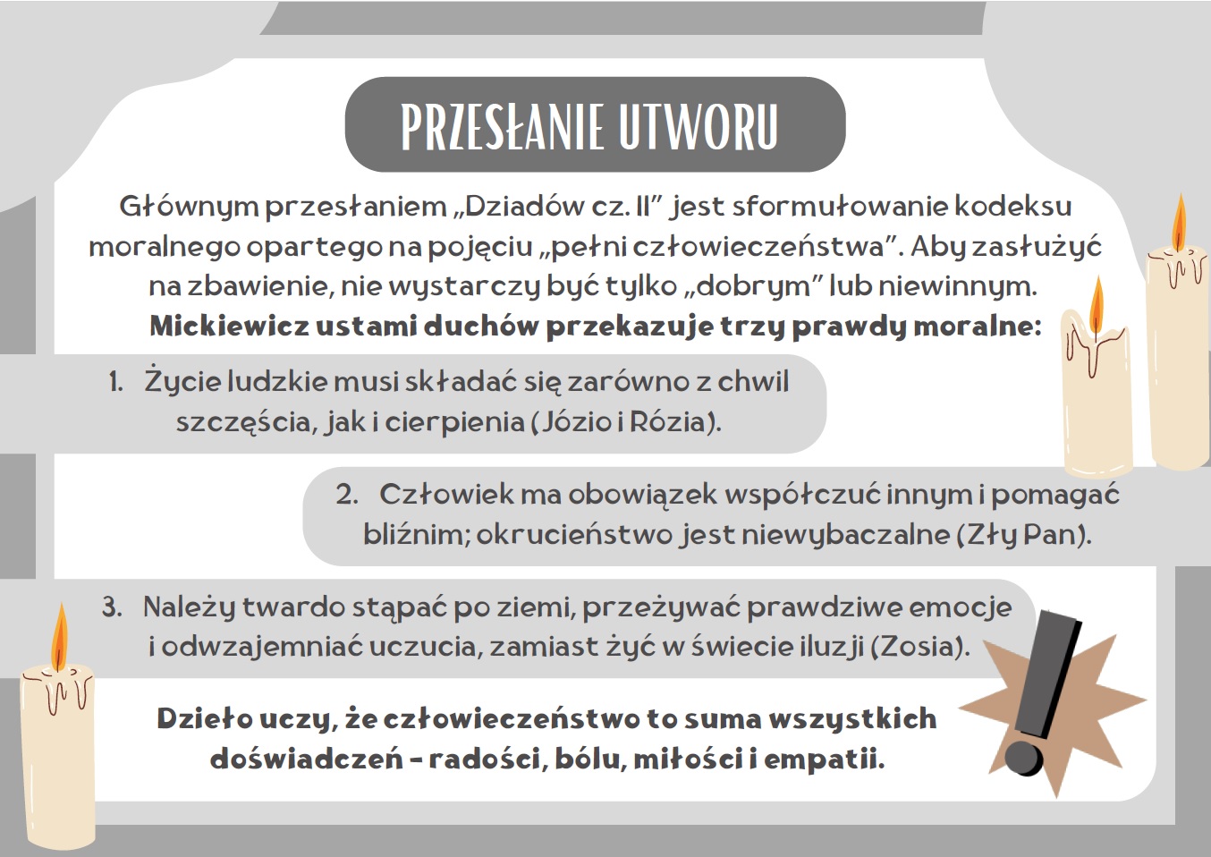 Uczniowie powinni przeczytać Dziady cz. II, ponieważ to krótka, ale bardzo treściwa lektura. Dziady cz. II wprowadza w świat romantyzmu, ukazuje ludowe wierzenia i tajemniczą atmosferę obrzędu dziadów. Uczy odpowiedzialności moralnej – pokazuje, że każdy czyn ma konsekwencje, a empatia i dobroć są niezbędne w życiu. Dodatkowo rozwija wrażliwość oraz umiejętność interpretacji i dyskusji.
