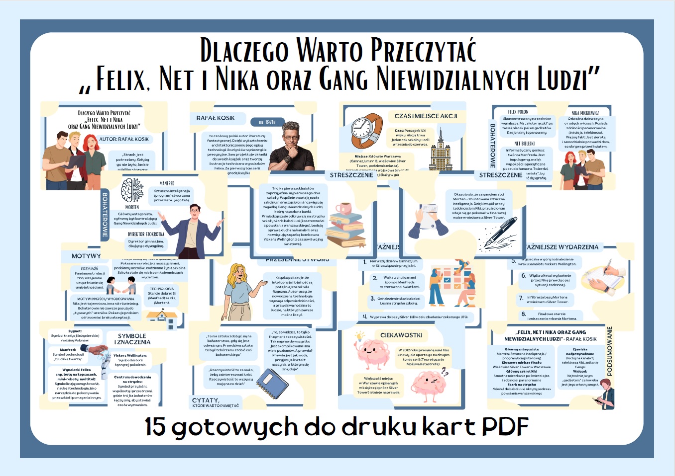 Przygotowana przeze mnie gazetka szkolna do druku: „Felix, Net i Nika oraz Gang Niewidzialnych Ludzi” to atrakcyjne i praktyczne wsparcie podczas omawiania lektury Felix, Net i Nika oraz Gang Niewidzialnych Ludzi. Zestaw zawiera aż 15 czytelnych kart PDF, które w uporządkowany i przystępny sposób przybliżają uczniom treść powieści oraz jej najważniejsze zagadnienia.