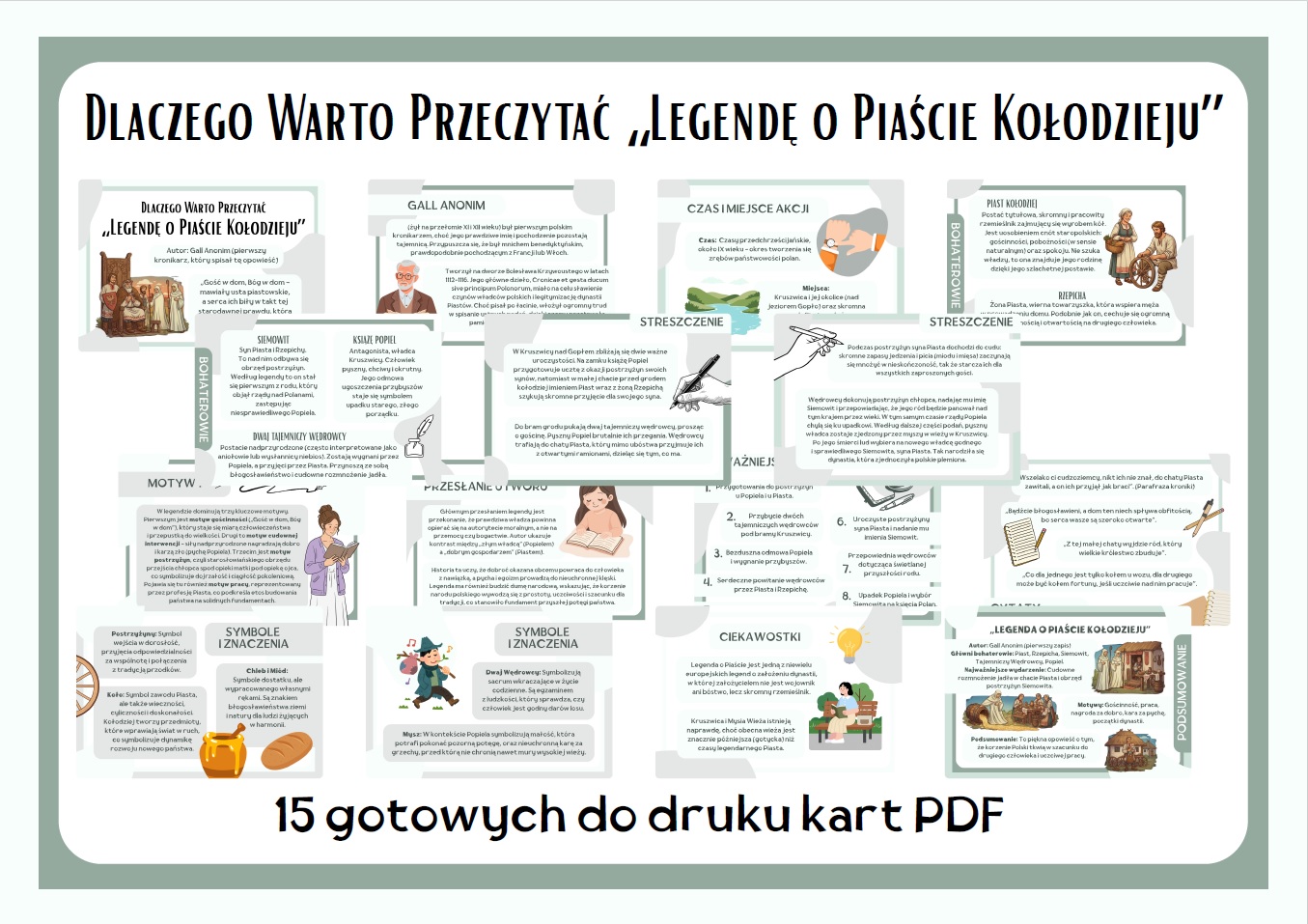 Moja gazetka szkolna do lektury Legenda o Piaście Kołodzieju to bardzo wygodne i wizualnie atrakcyjne wsparcie podczas omawiania początków państwa polskiego. Gazetka pomoże Twoim uczniom zrozumieć treść legendy, przybliża postać Piasta, znaczenie gościnności oraz moralne przesłanie utworu.