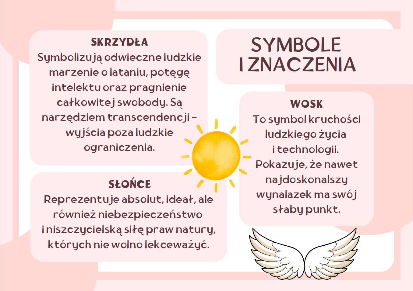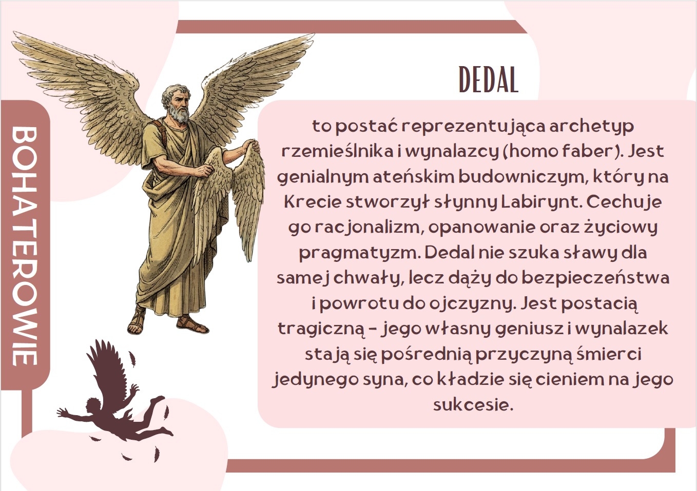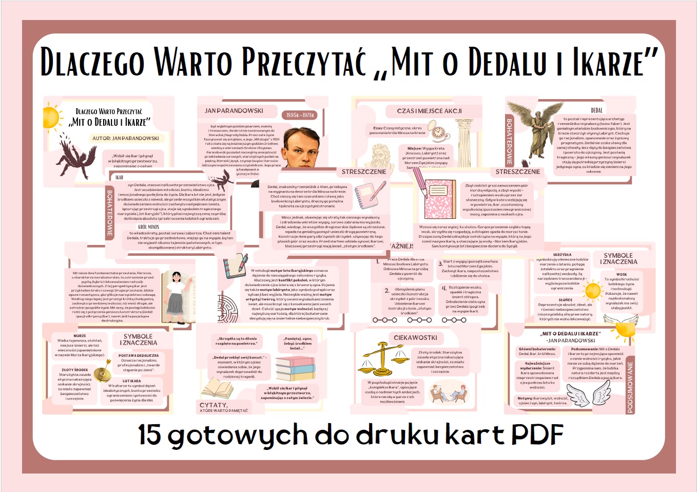 Moje materiały ułatwiają uczniom zrozumienie symboliki i sensu utworu Mit o Dedalu i Ikarze, a jednocześnie doskonale sprawdzają się jako estetyczna dekoracja sali lub szkolnego korytarza. To gotowy do wydruku zestaw, który oszczędza czas nauczyciela i wzbogaca lekcje o wartościowe materiały wizualne.