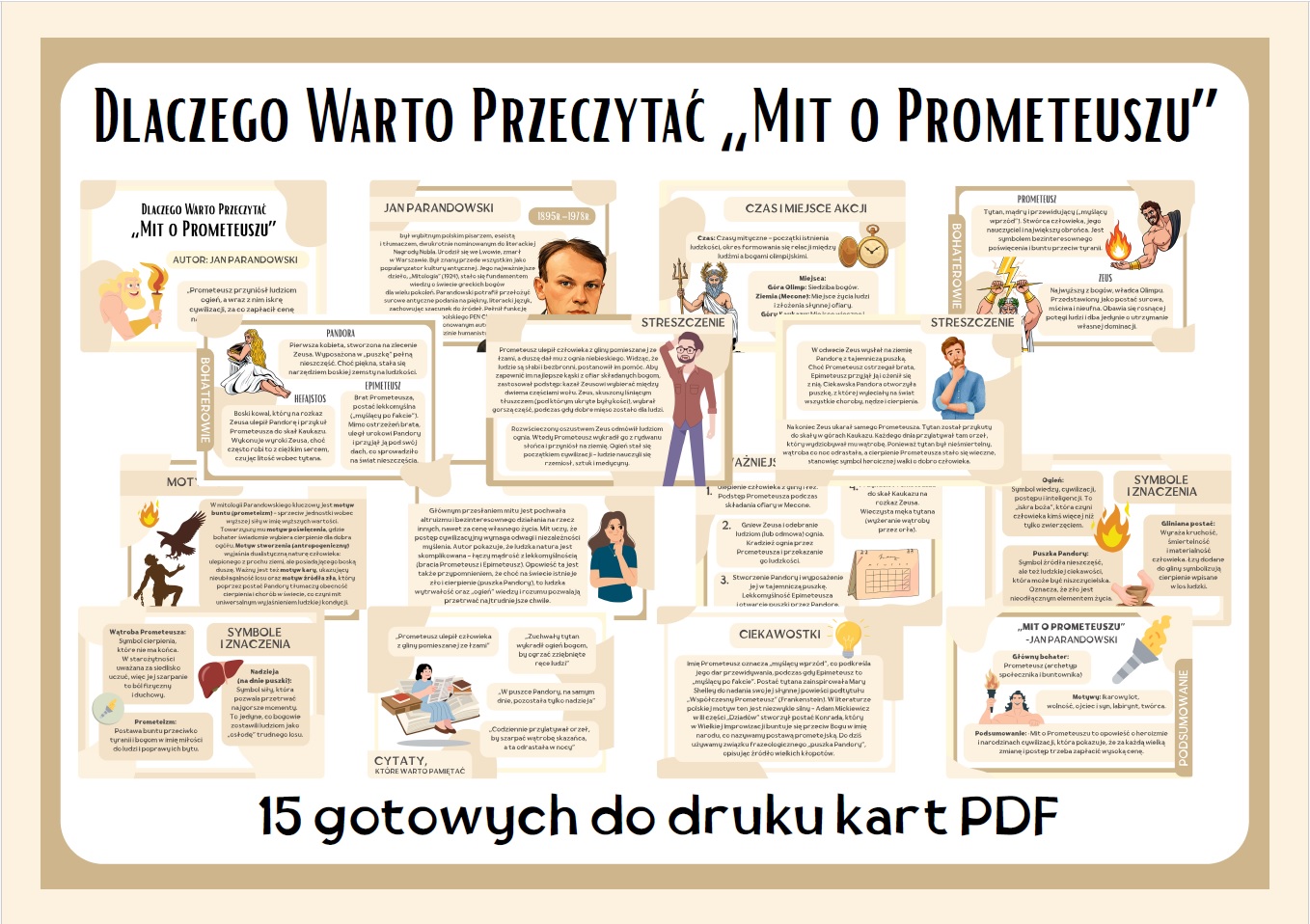 Moja gazetka składa się z aż 15 estetycznych kart PDF, omawiających treść mitu, postać Prometeusza, główne motywy i przesłanie utworu oraz jego ponadczasową aktualność.