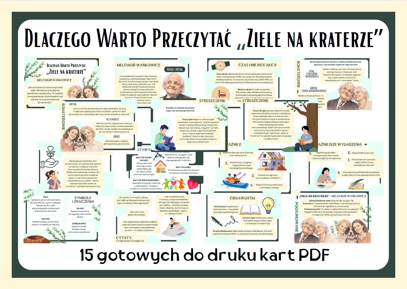 Przygotowana gazetka szkolna do druku – „Ziele na kraterze” to gotowe wsparcie dla nauczyciela języka polskiego podczas omawiania tej poruszającej lektury. Zestaw składa się z aż 15 estetycznych kart PDF, które w przystępny i czytelny sposób przybliżają uczniom treść książki Ziele na kraterze.