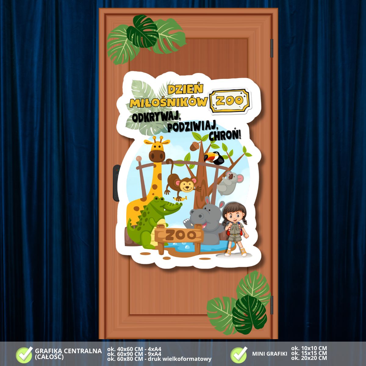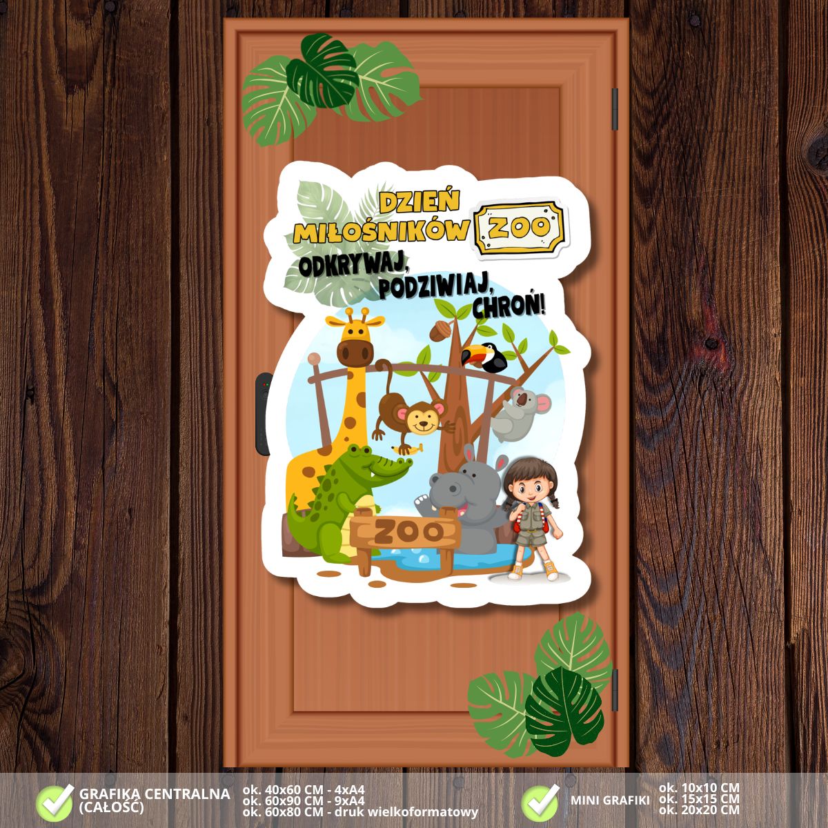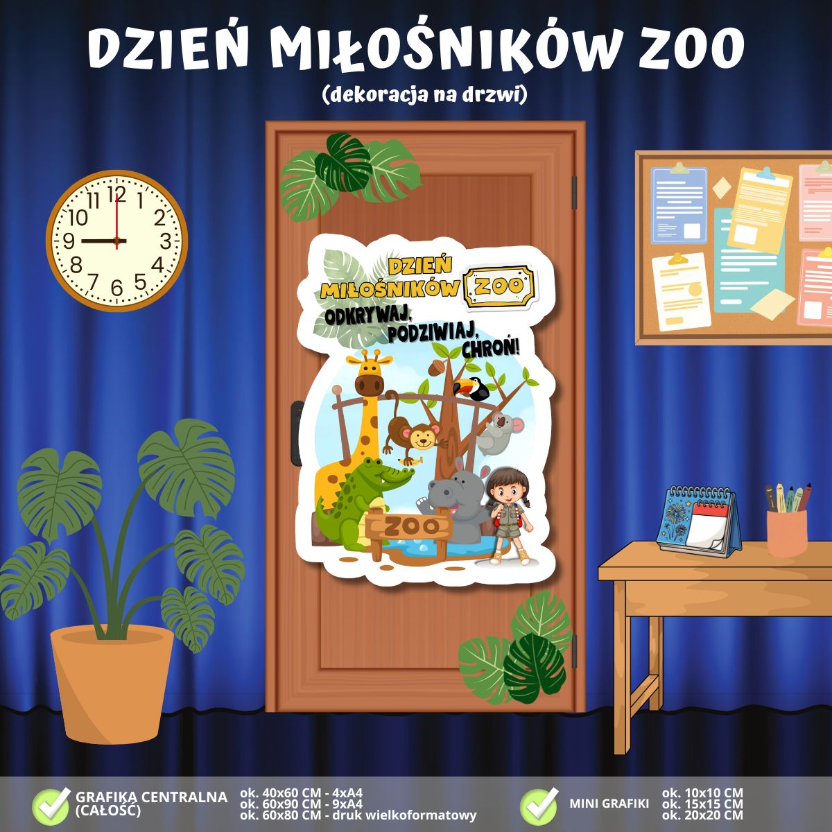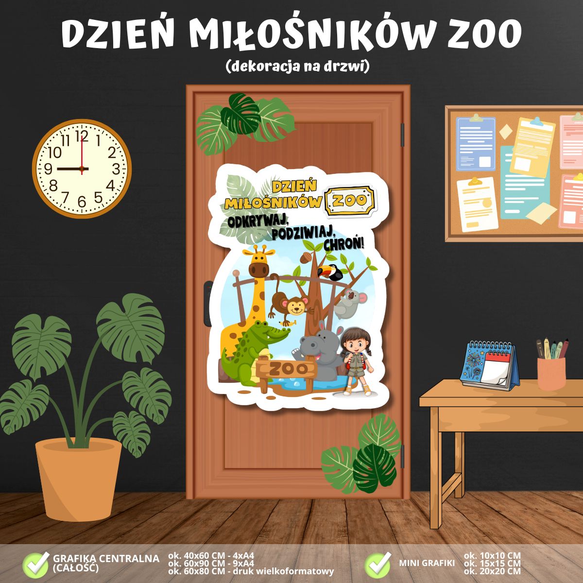 Zadbaj o wyjątkowy i edukacyjny wystrój w swojej klasie! Nasza najnowsza dekoracja na drzwi to połączenie pasji do przyrody z radosnym przekazem, która wprowadzi uczniów w świat dzikich zwierząt i zamieni wejście do sali w prawdziwą bramę do egzotycznego ogrodu: