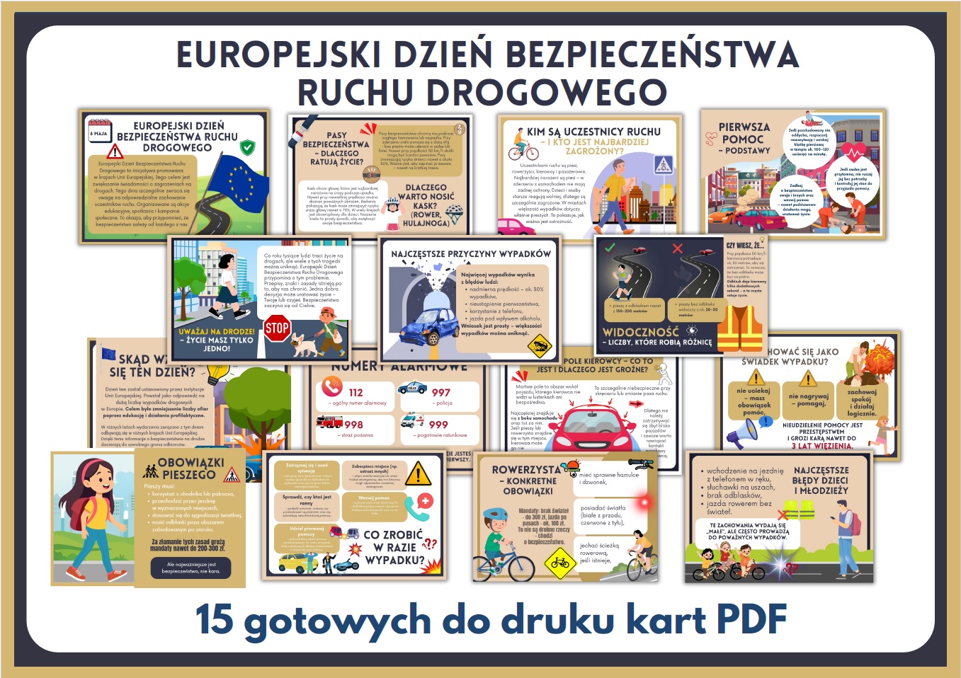 Przygotuj ciekawą i wartościową gazetkę szkolną na Europejski Dzień Bezpieczeństwa Ruchu Drogowego! Ten zestaw to aż 15 kart PDF, które w atrakcyjny i czytelny sposób pomogą przybliżyć uczniom zasady bezpiecznego poruszania się po drogach.