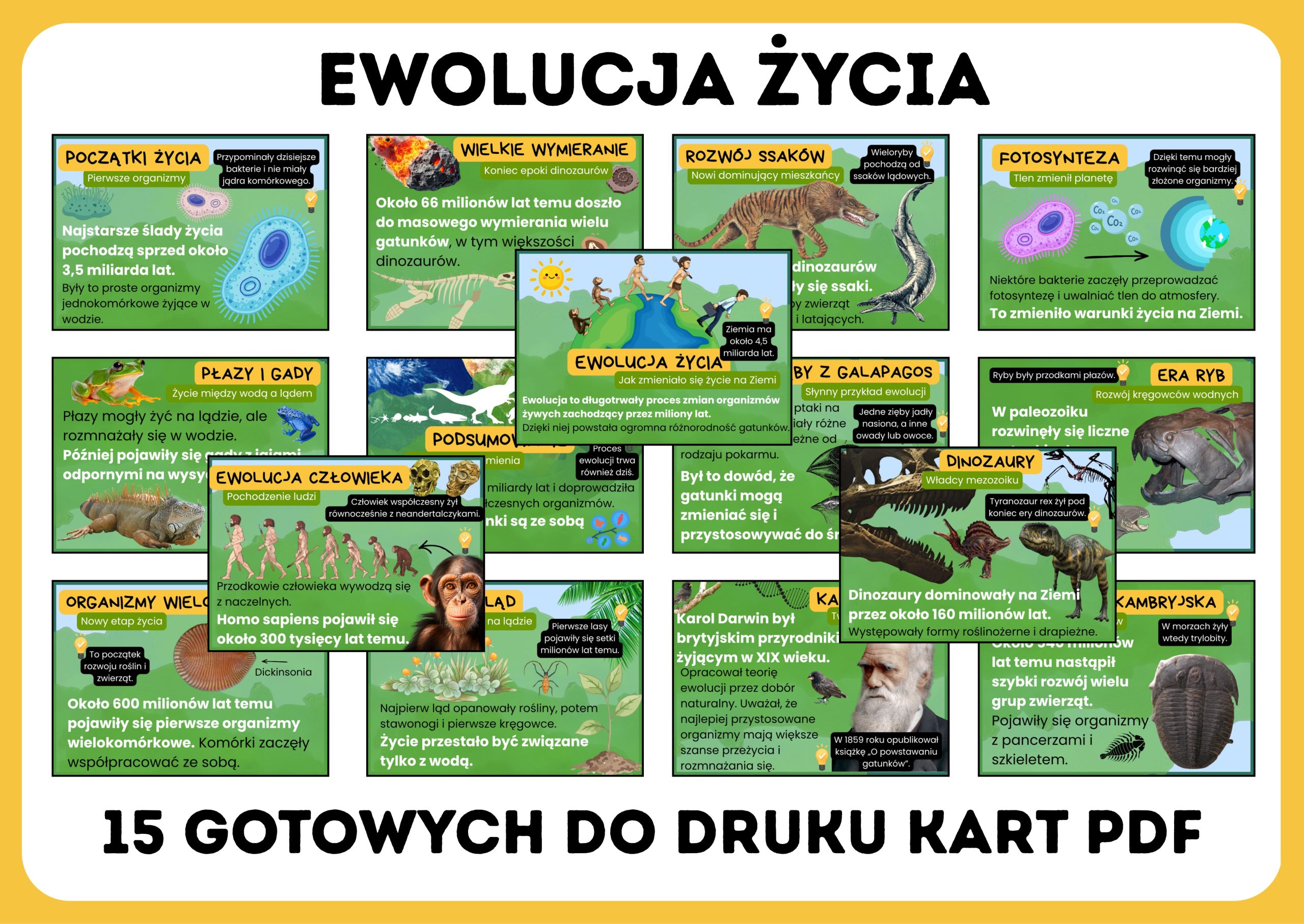 Przygotuj atrakcyjną gazetkę szkolną o ewolucji życia i pomóż uczniom lepiej zrozumieć, jak rozwijały się organizmy na Ziemi przez miliony lat! Zestaw zawiera aż 15 kart PDF, które w przejrzysty i ciekawy sposób przedstawiają najważniejsze informacje o zmianach zachodzących w świecie przyrody oraz o rozwoju życia na naszej planecie.