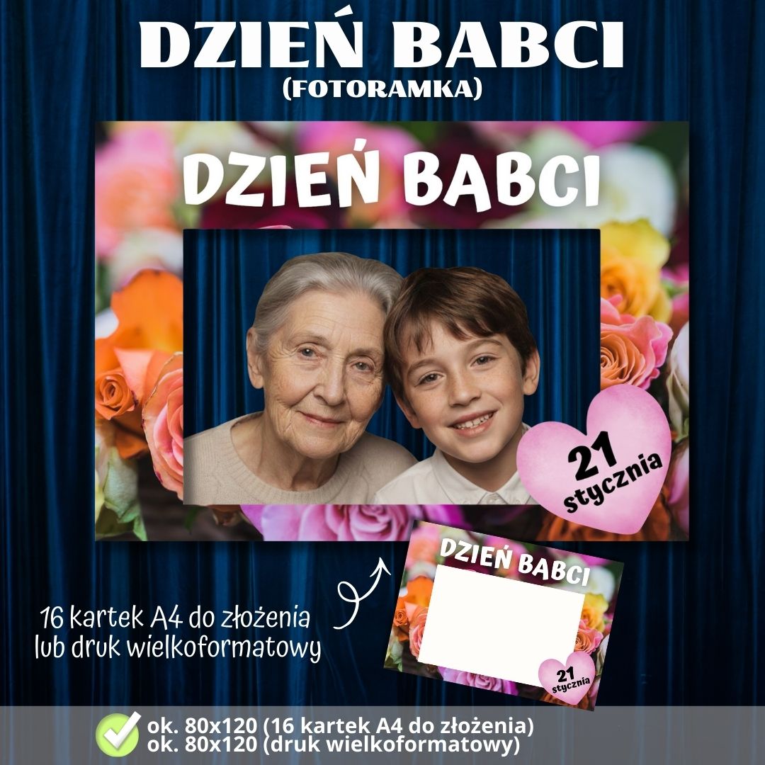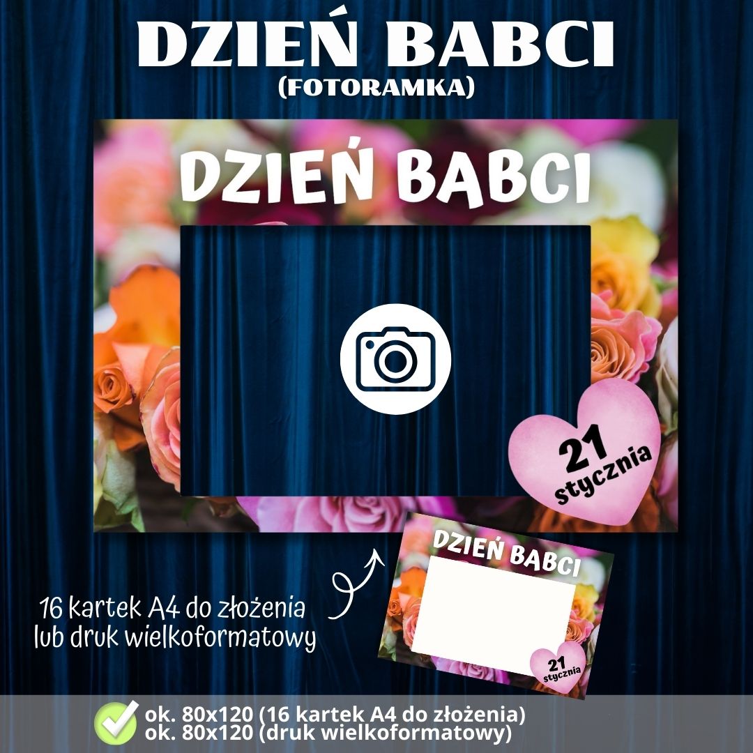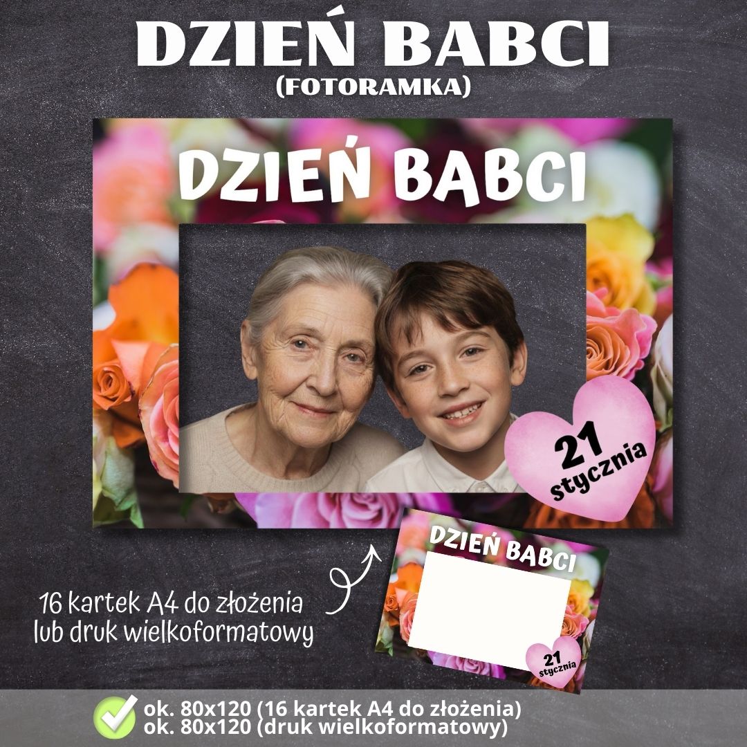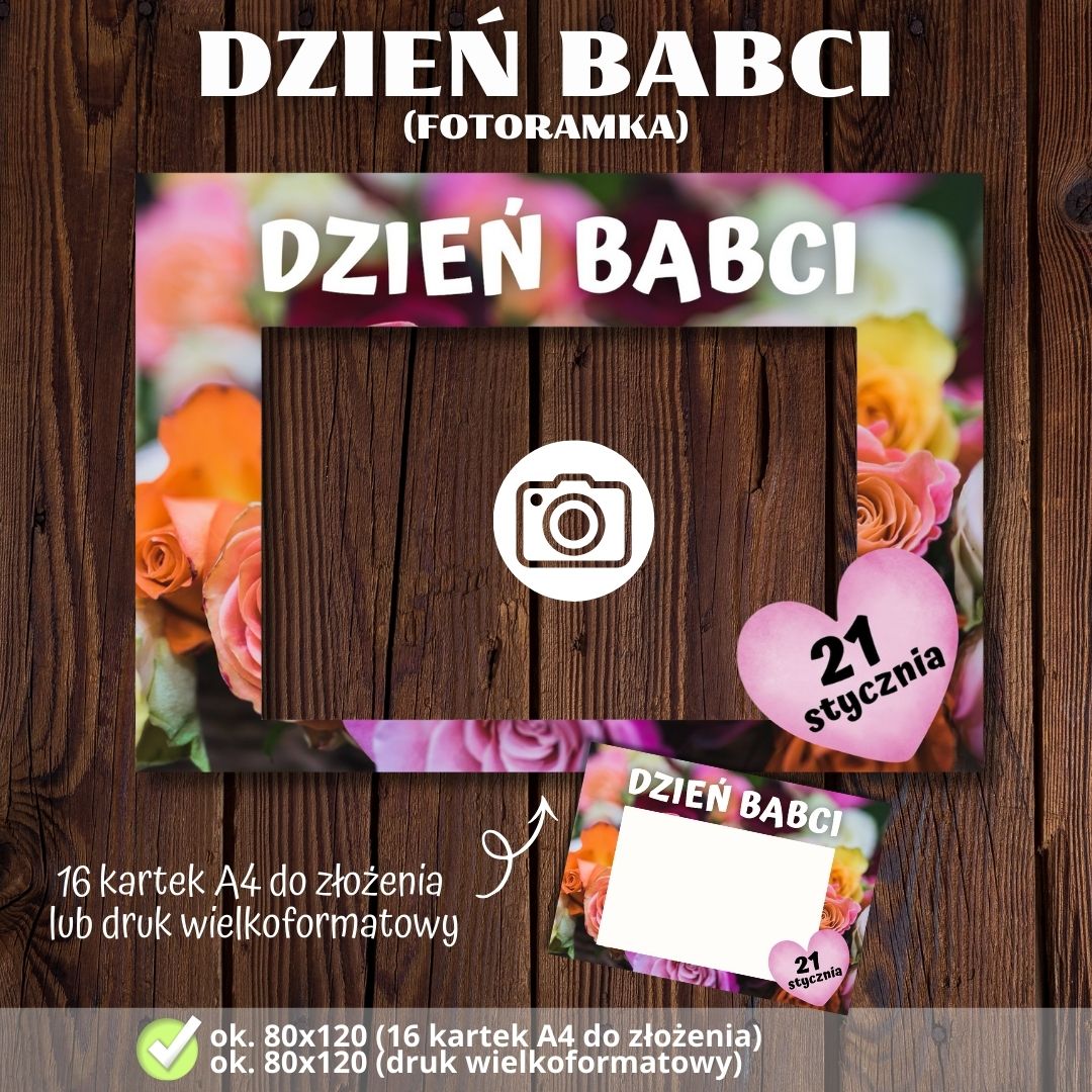 Fotoramka utrzymana jest w ciepłej, kwiatowej stylistyce. Centralnie w górnej części umieszczony jest napis „DZIEŃ BABCI”, a na dole – różowe serce z datą „21 stycznia” (Dzień Babci).