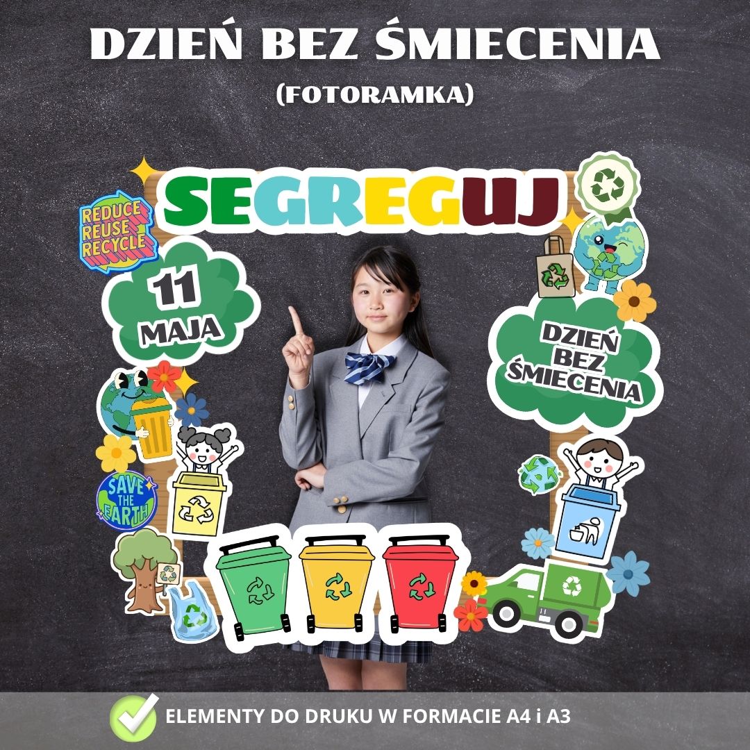 W skład zestawu wchodzi komplet kolorowych elementów do wydruku, umożliwiający stworzenie atrakcyjnej ramy o tematyce ekologicznej. Jest to idealne narzędzie do upamiętnienia proekologicznych inicjatyw, warsztatów recyklingowych oraz obchodów Dnia Bez Śmiecenia (11 maja).