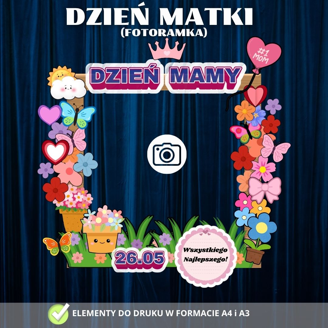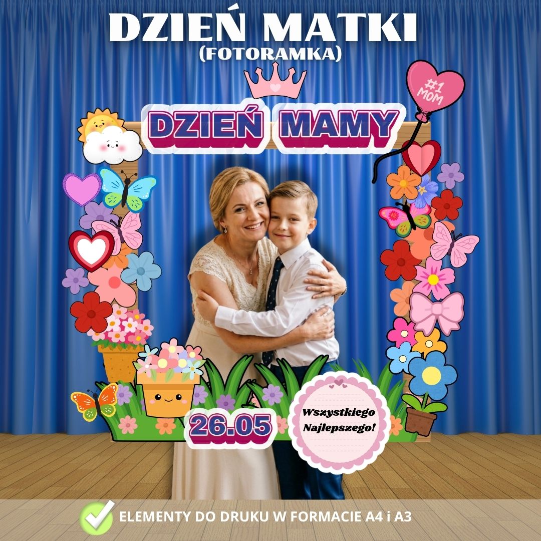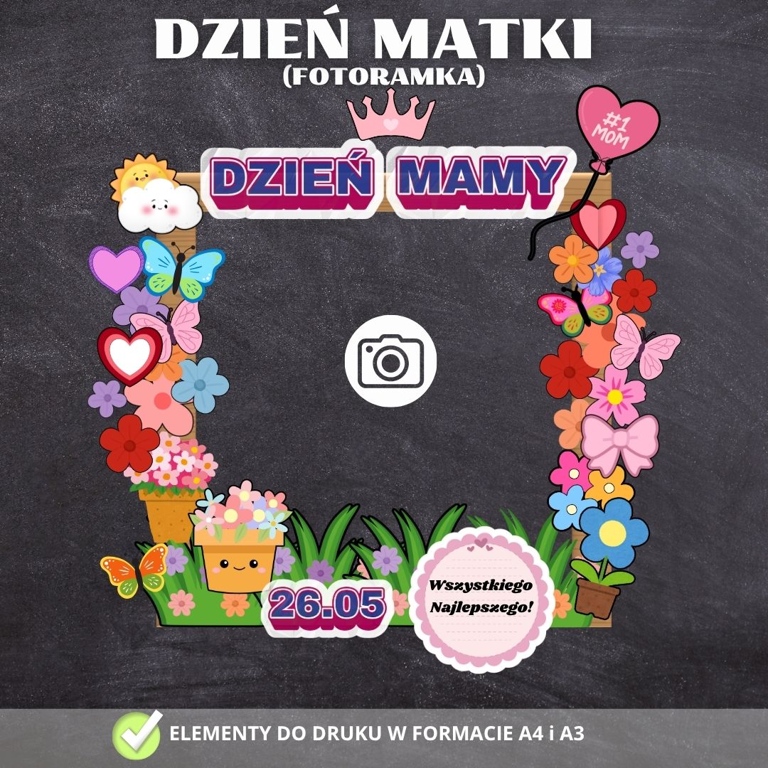 W skład zestawu wchodzi komplet kolorowych elementów do wydruku, umożliwiający stworzenie radosnej i kwiecistej ramy o tematyce Dnia Matki. Jest to idealny rekwizyt do wykonania pamiątkowych zdjęć, które staną się wzruszającym prezentem dla każdej mamy.