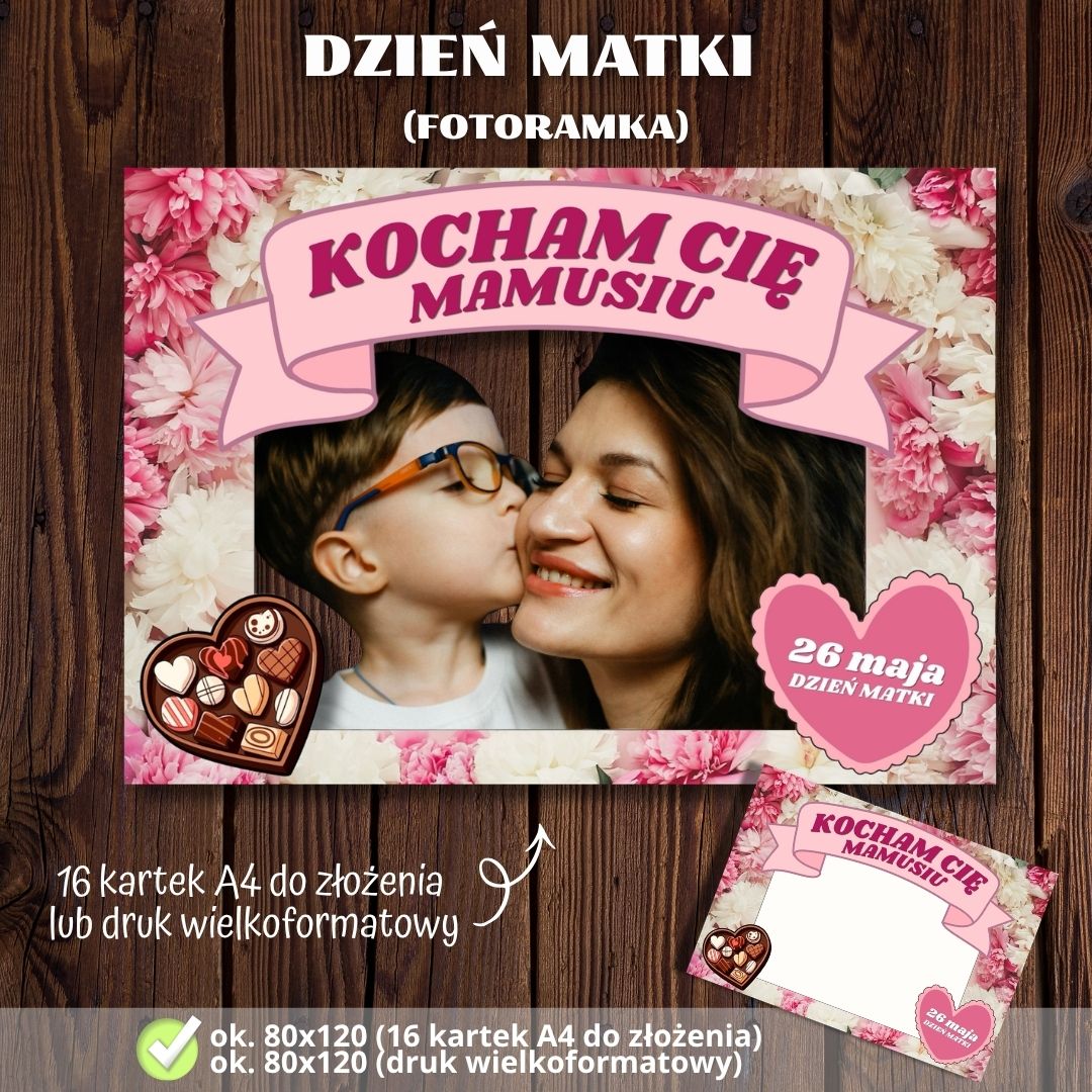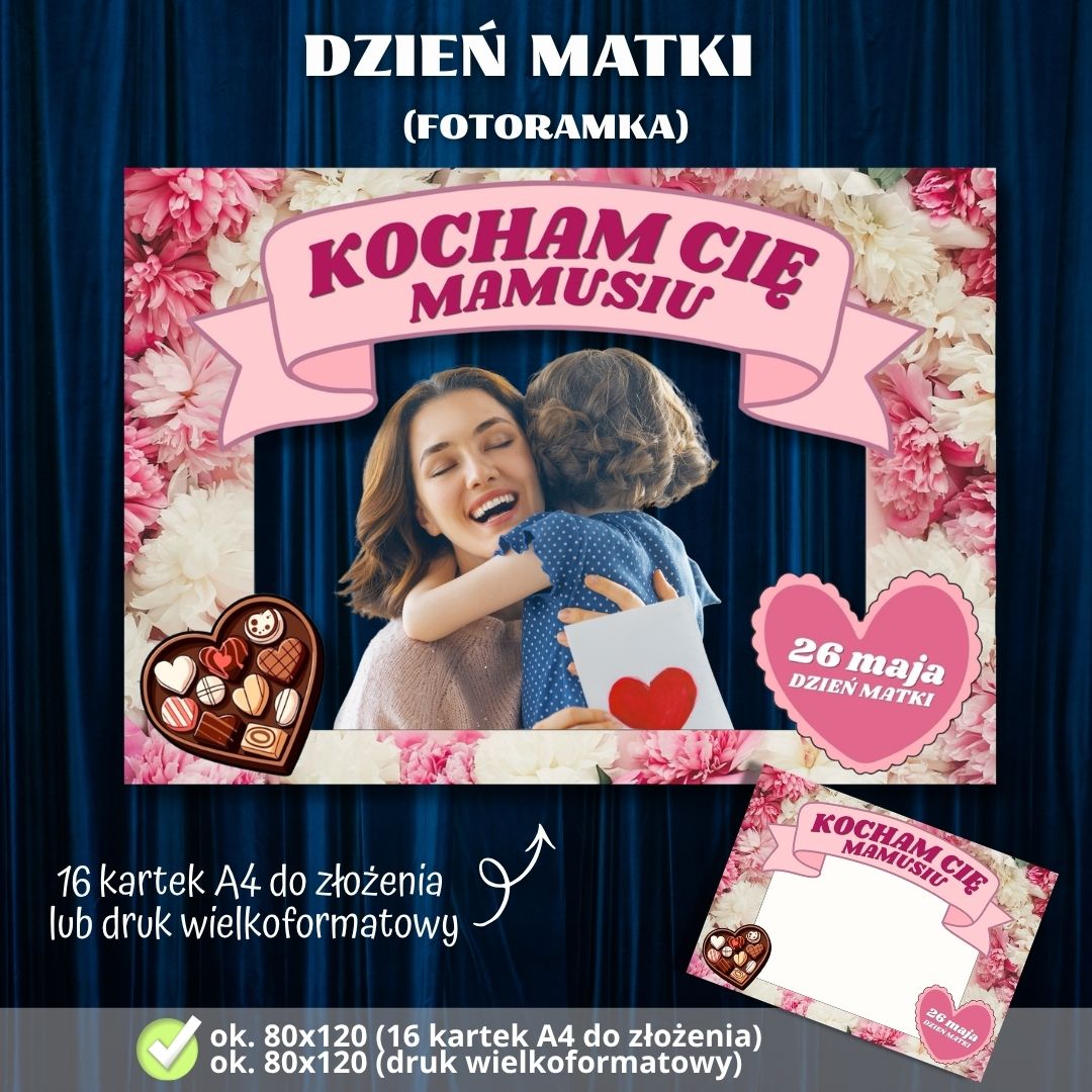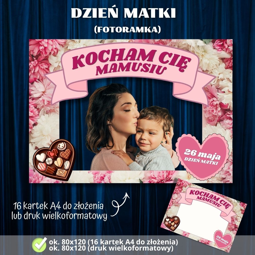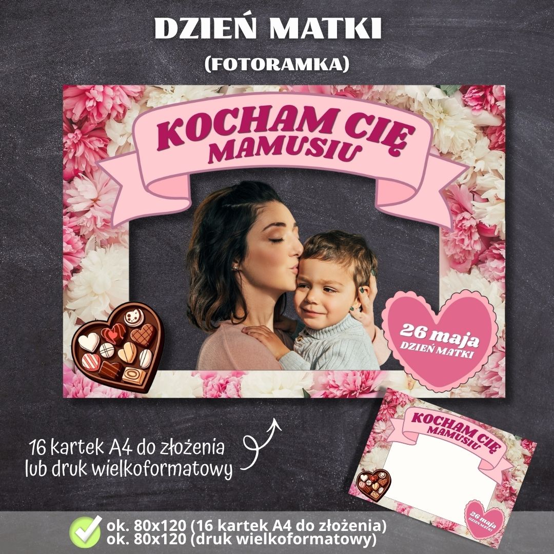 Fotoramka utrzymana jest w ciepłej, kwiatowej estetyce. Dominują odcienie różu i bieli, a obramowanie zdobią realistyczne grafiki piwonii i goździków. W górnej części znajduje się ozdobna różowa wstęga z napisem: „KOCHAM CIĘ MAMUSIU”. W dolnym rogu umieszczono serce z datą „26 maja – DZIEŃ MATKI” oraz grafikę eleganckich czekoladek w kształcie serca. Całość tworzy pełne miłości i wdzięczności tło do pamiątkowych fotografii.