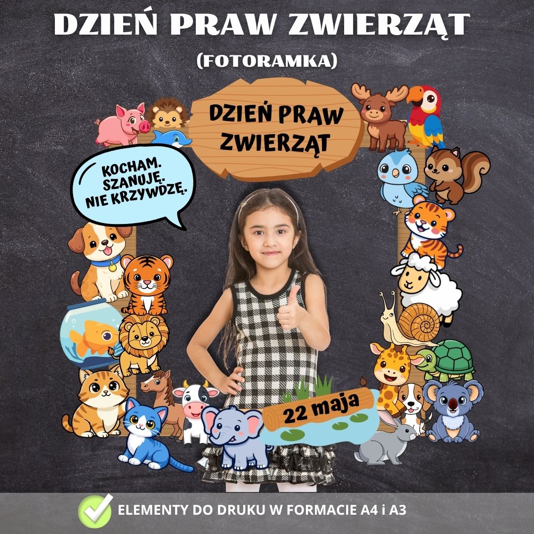W skład zestawu wchodzi komplet kolorowych elementów do wydruku, umożliwiający stworzenie radosnej i edukacyjnej ramy o tematyce prozwierzęcej, idealnej do obchodów Dnia Praw Zwierząt oraz zajęć przyrodniczych.