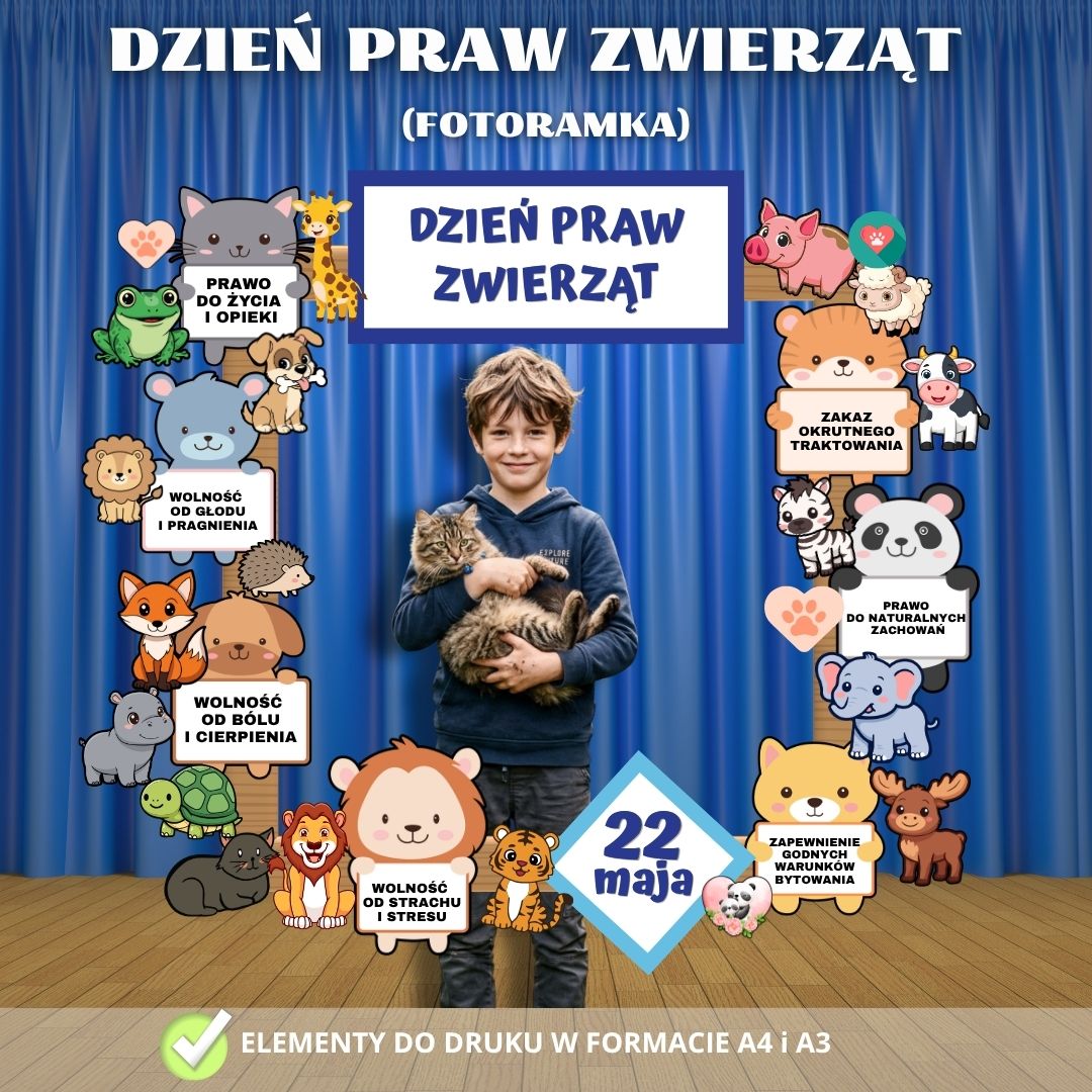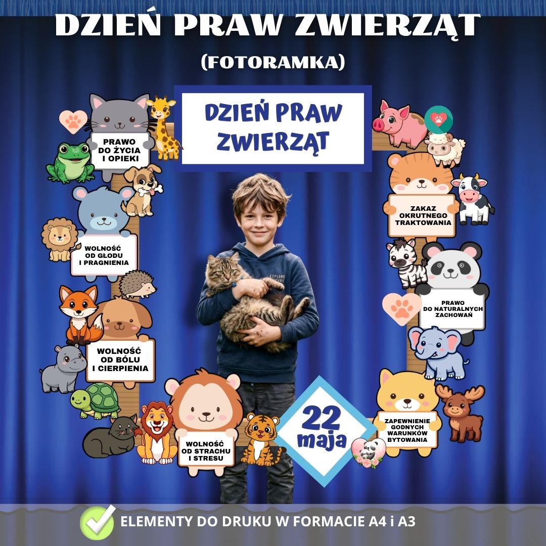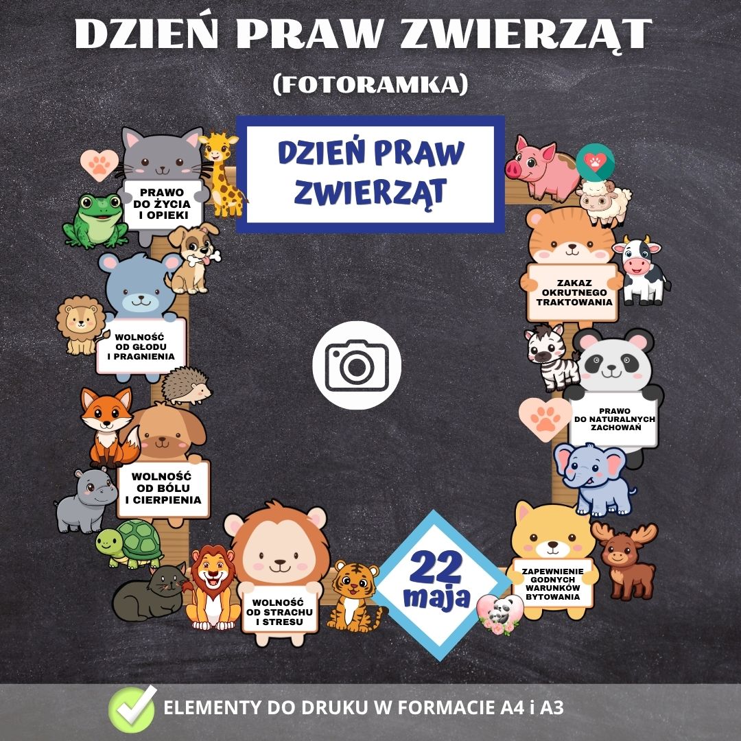 W skład zestawu wchodzi komplet elementów do wydruku, umożliwiający stworzenie edukacyjnej i radosnej ramy o tematyce praw zwierząt. Jest to idealne narzędzie do upamiętnienia obchodów 22 maja, promujące empatię oraz szacunek wobec wszystkich istot żywych.