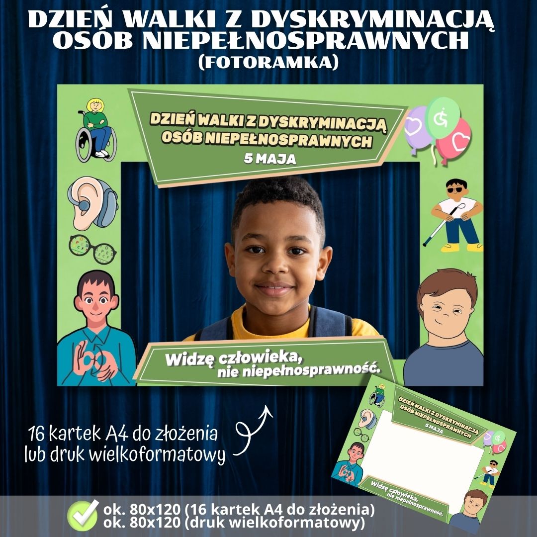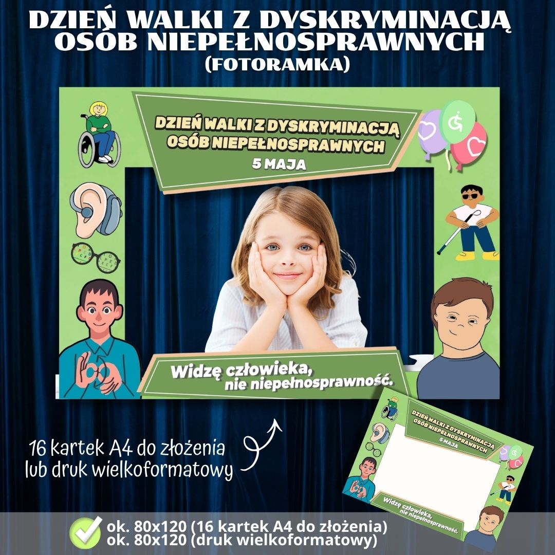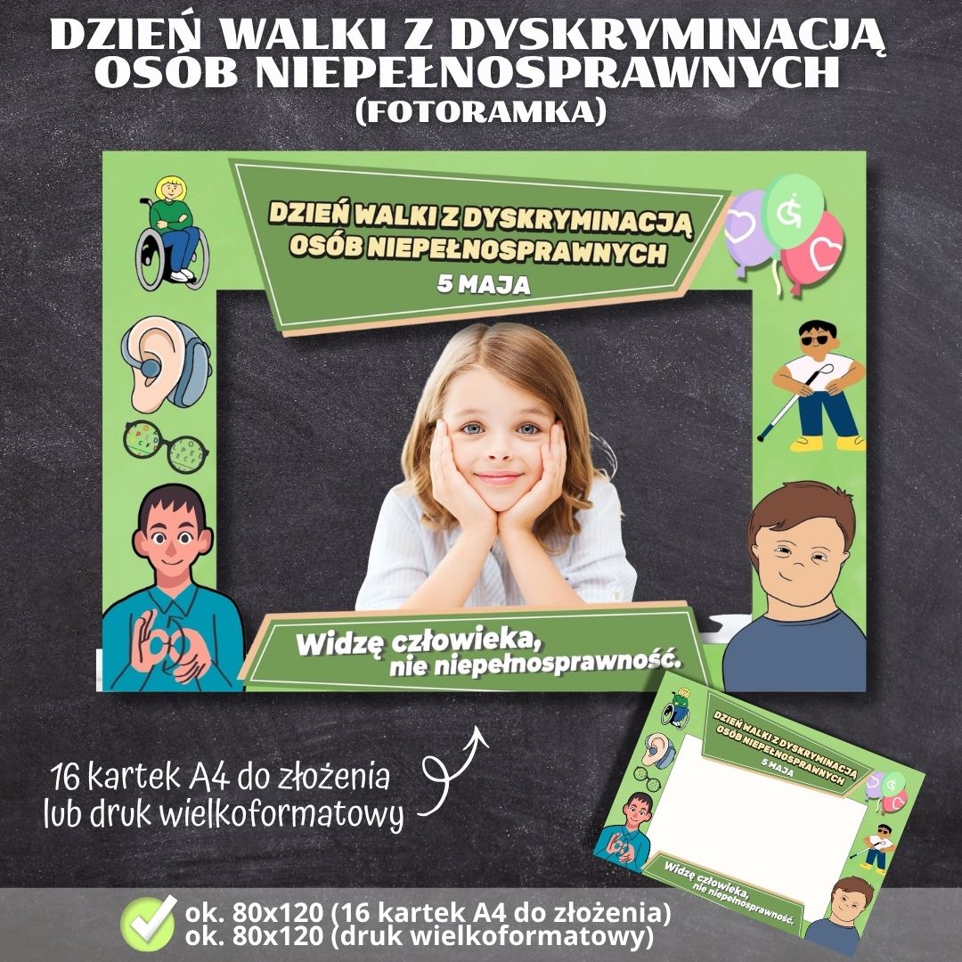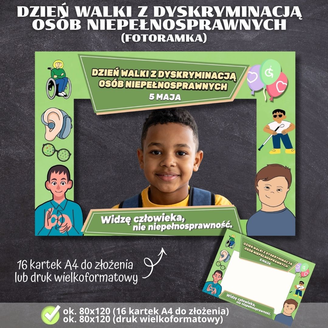 Zestaw materiałów do druku, który pozwoli przygotować edukacyjną pamiątkę oraz element dekoracyjny z okazji obchodów Dnia Walki z Dyskryminacją Osób Niepełnosprawnych oraz Dnia Godności Osoby z Niepełnosprawnością Intelektualną. Idealny do wykorzystania podczas lekcji wychowawczych, apeli oraz warsztatów z zakresu empatii i inkluzywności w szkołach i przedszkolach.