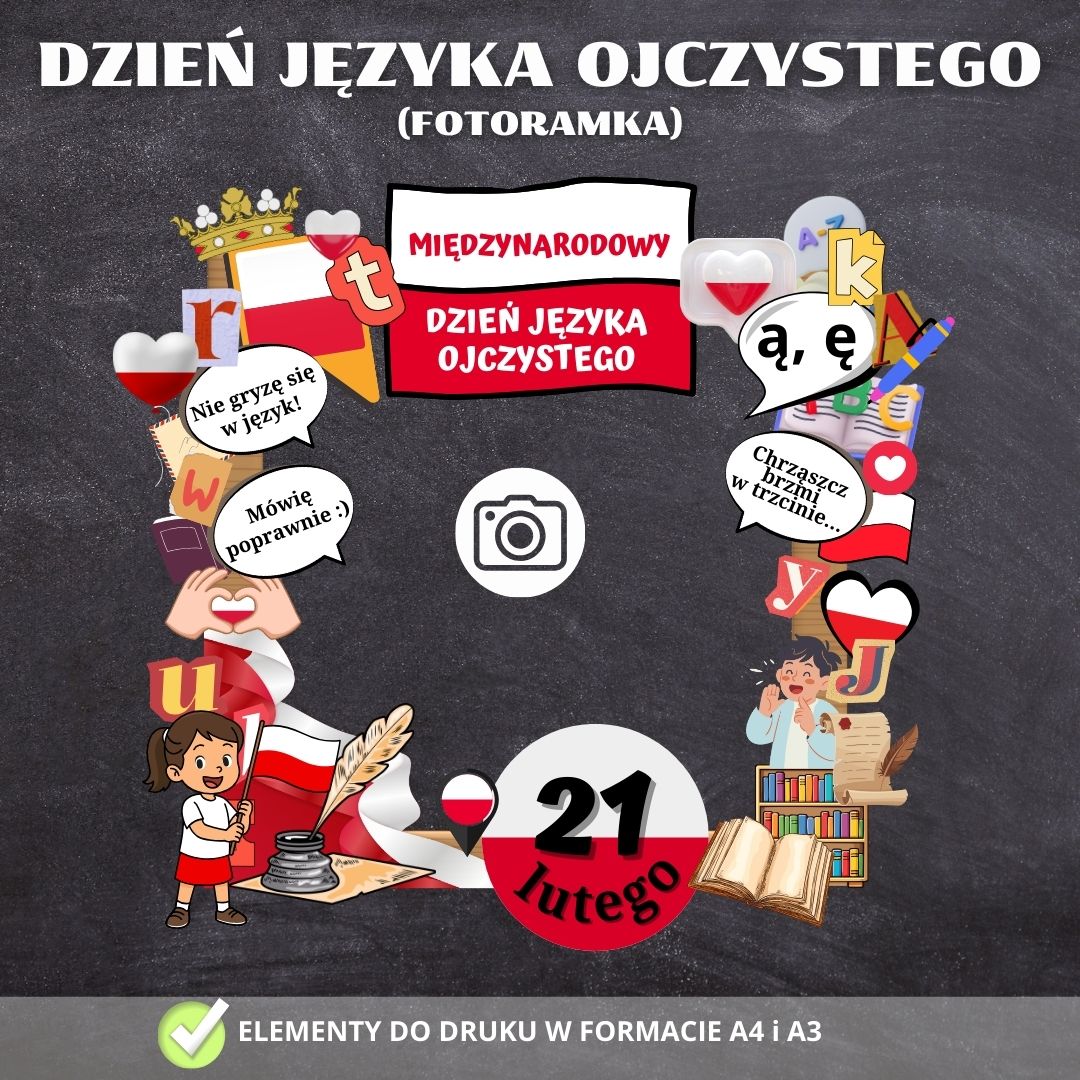 W skład zestawu wchodzi komplet elementów do wydruku (80 stron A4), umożliwiający stworzenie edukacyjnej i dekoracyjnej ramy o tematyce związanej z polszczyzną oraz obchodami Dnia Języka Ojczystego.