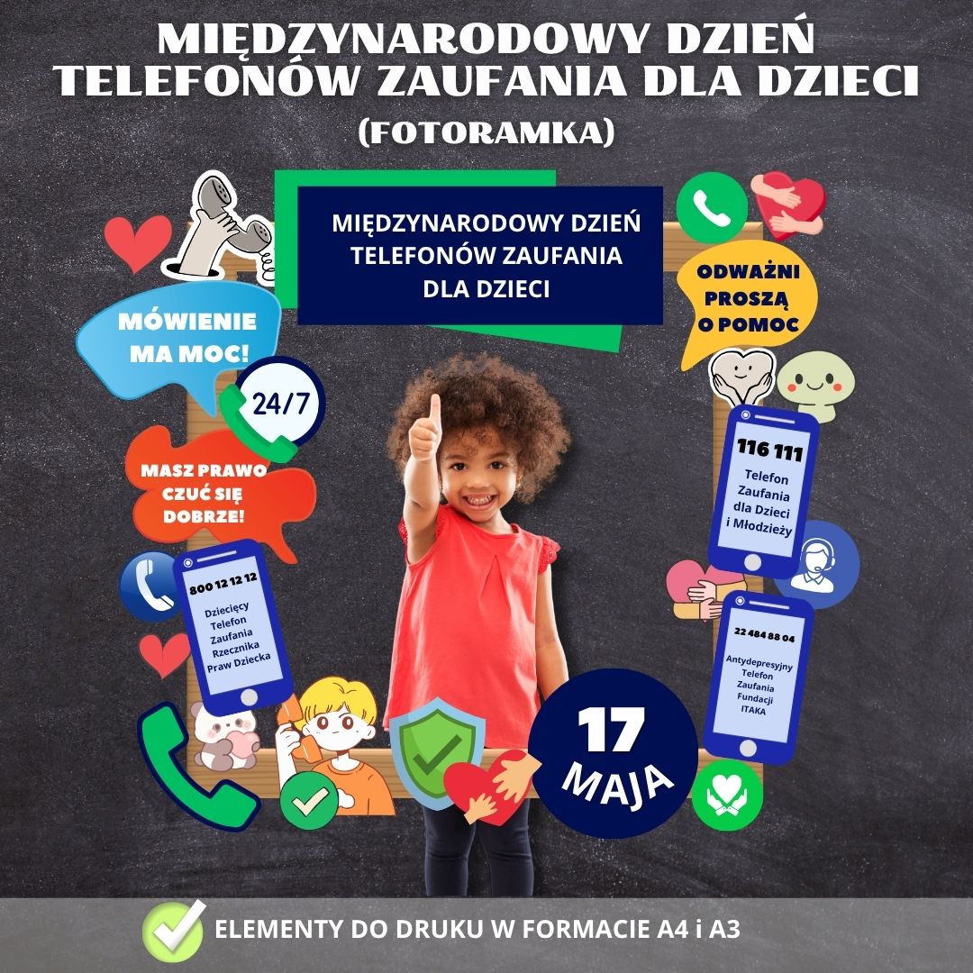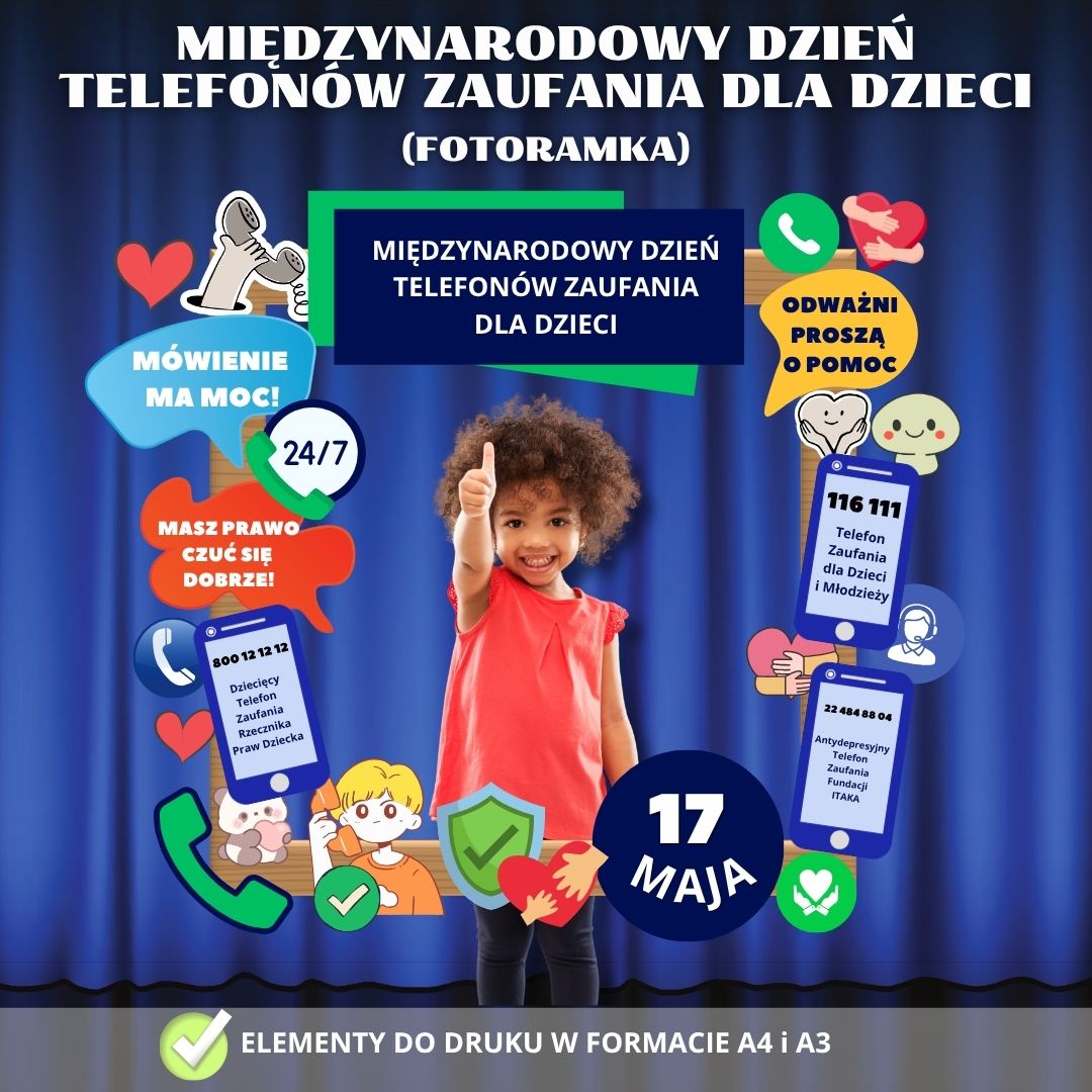 - Główny tytuł: Granatowa tabliczka z białym napisem „MIĘDZYNARODOWY DZIEŃ TELEFONÓW ZAUFANIA DLA DZIECI”.