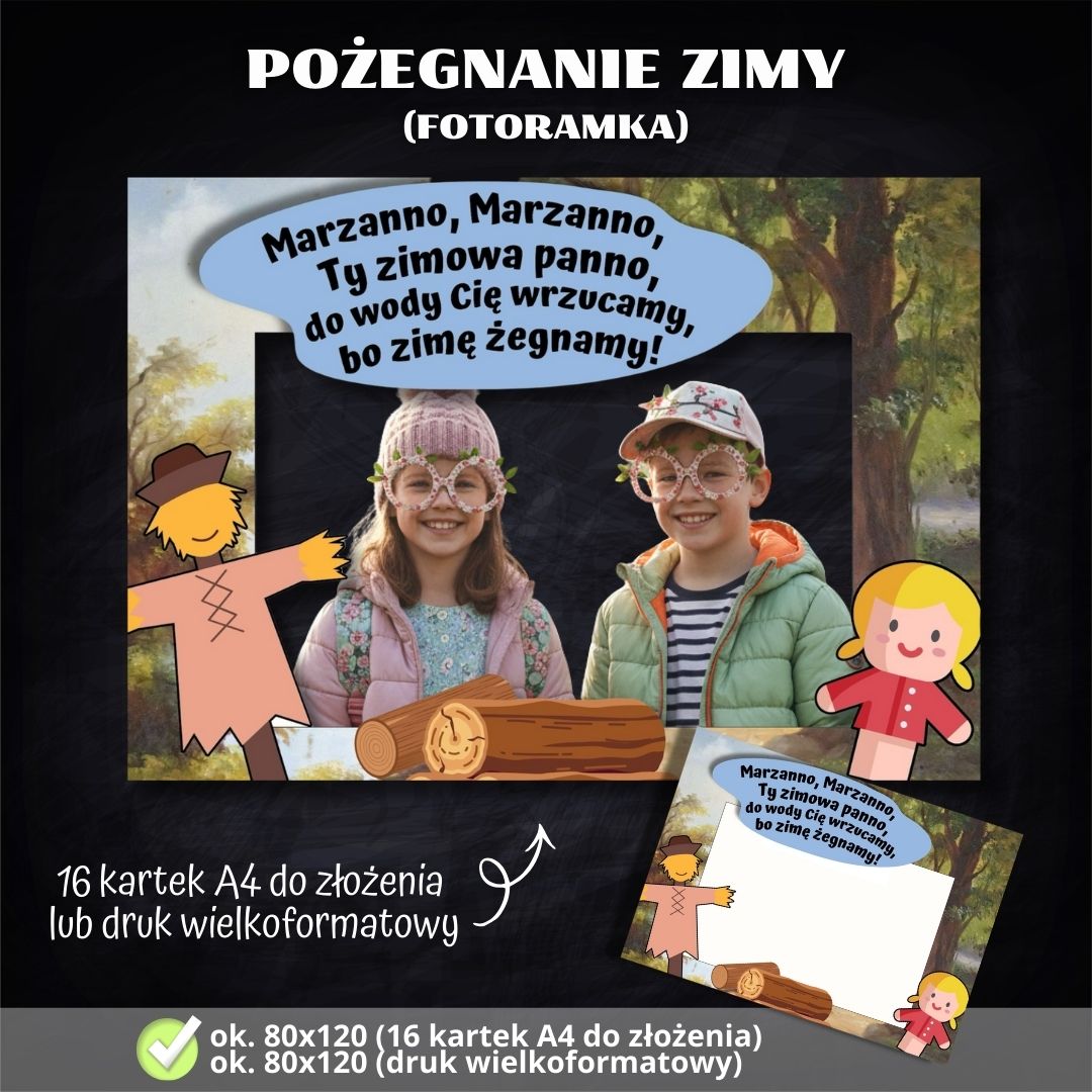 W górnej części, w błękitnej chmurce, widnieje tradycyjna rymowanka: „Marzanno, Marzanno, Ty zimowa panno, do wody Cię wrzucamy, bo zimę żegnamy!”. Całość tworzy nostalgiczną, a zarazem pełną humoru oprawę do pamiątkowych zdjęć.