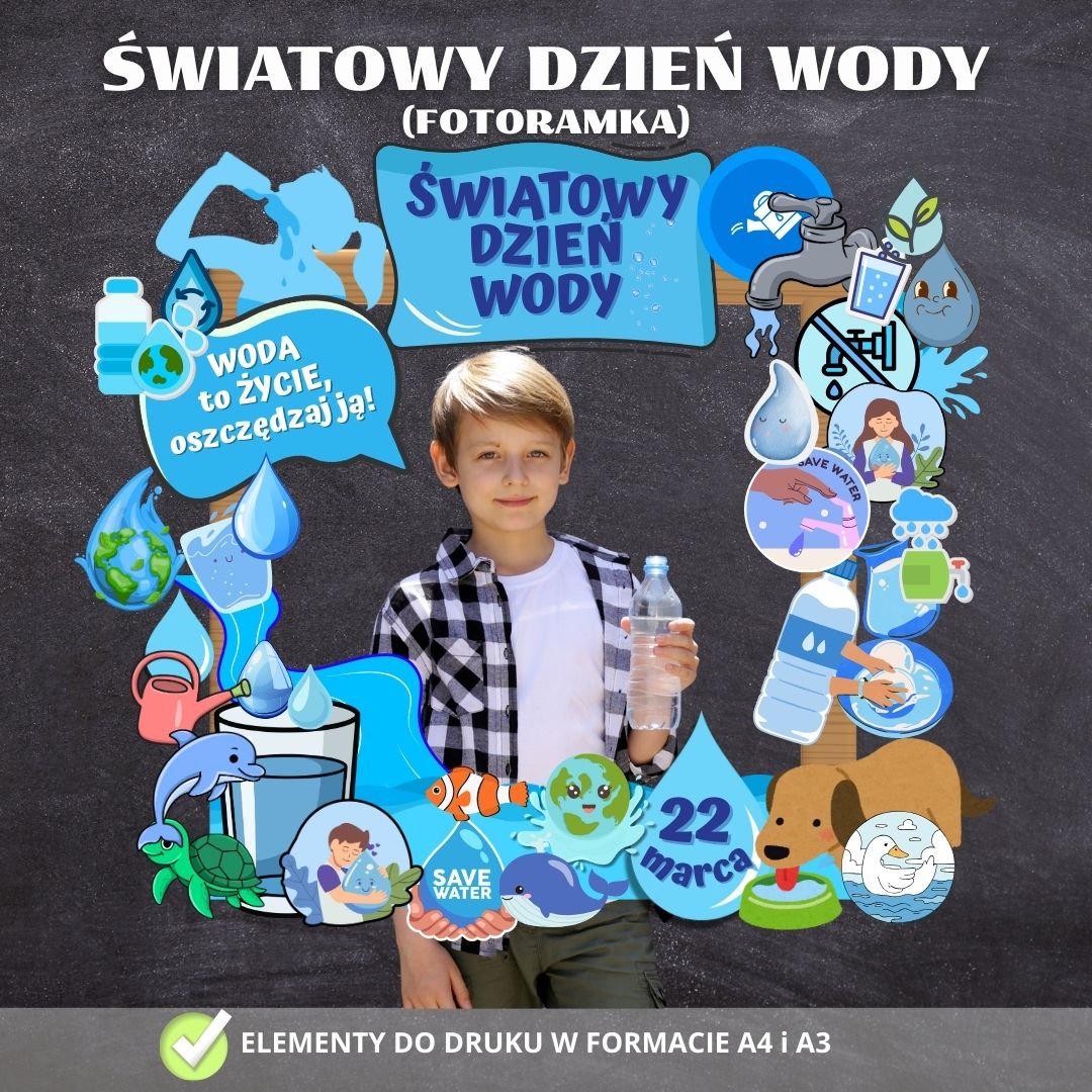 W skład zestawu wchodzi komplet elementów do wydruku, umożliwiający stworzenie dekoracyjnej ramy o tematyce ekologicznej i edukacyjnej, w błękitnej, radosnej kolorystyce, idealnej do świętowania znaczenia wody w naszym życiu.