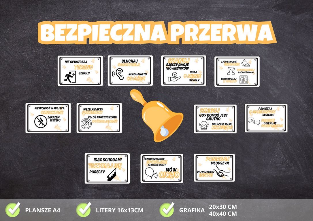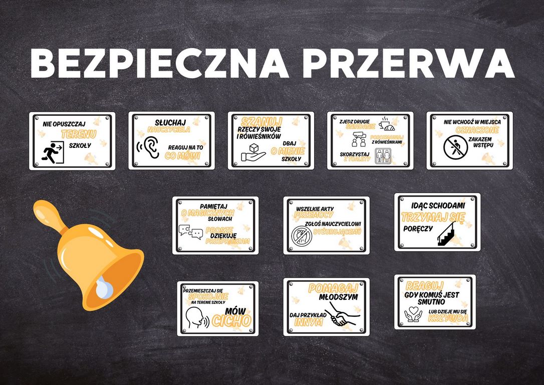 - 11 kart formatu A4, opisujących zasady bezpiecznych, właściwych zachowań uczniów w czasie przerw