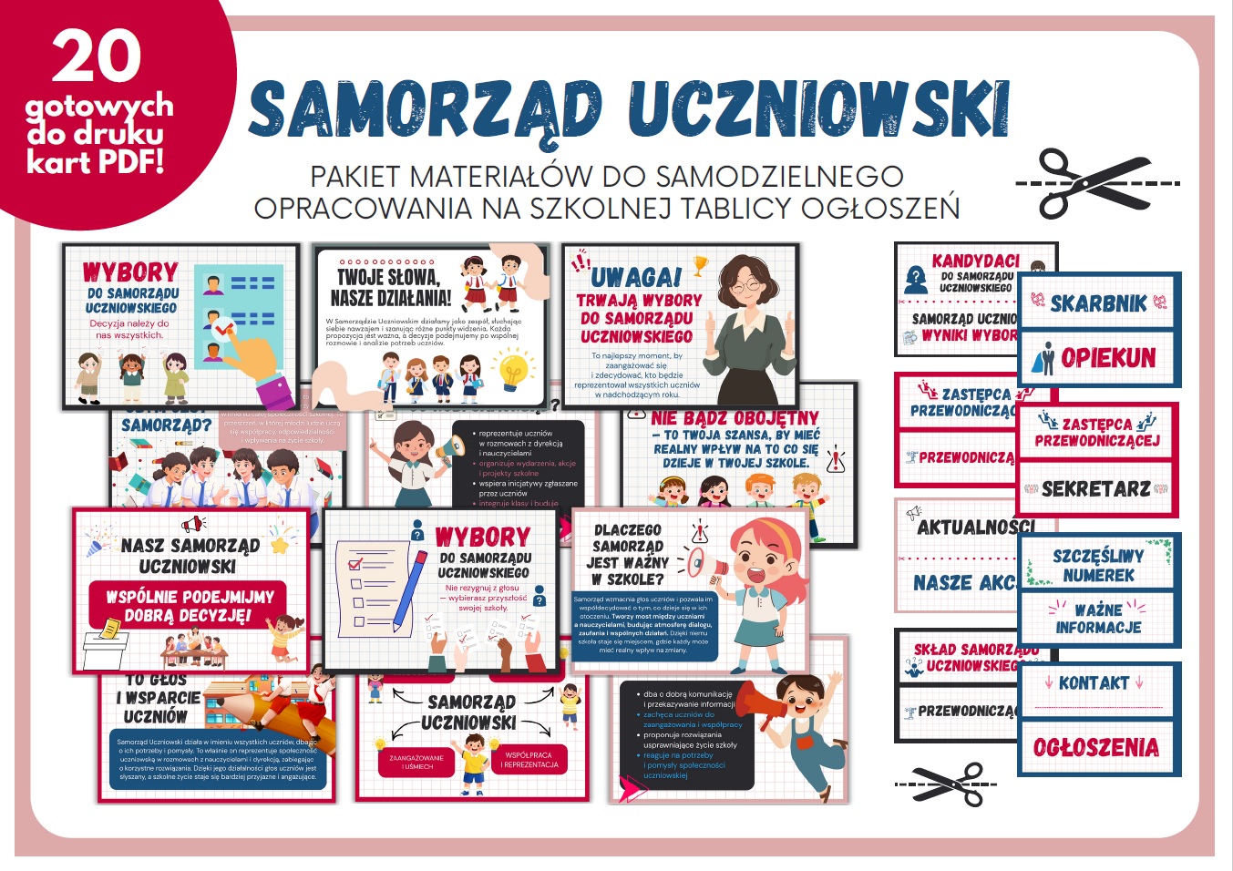 Mam dla Was świetną gazetkę samorządu uczniowskiego (aż 20 kart PDF), która świetnie sprawdzi się zarówno jako plakat wyborczy, jak i dekoracja porządkująca strukturę samorządu przez cały rok szkolny. W zestawie znajdziecie praktyczne karty idealne do wykorzystania podczas kampanii, a także jako stały element szkolnej przestrzeni.