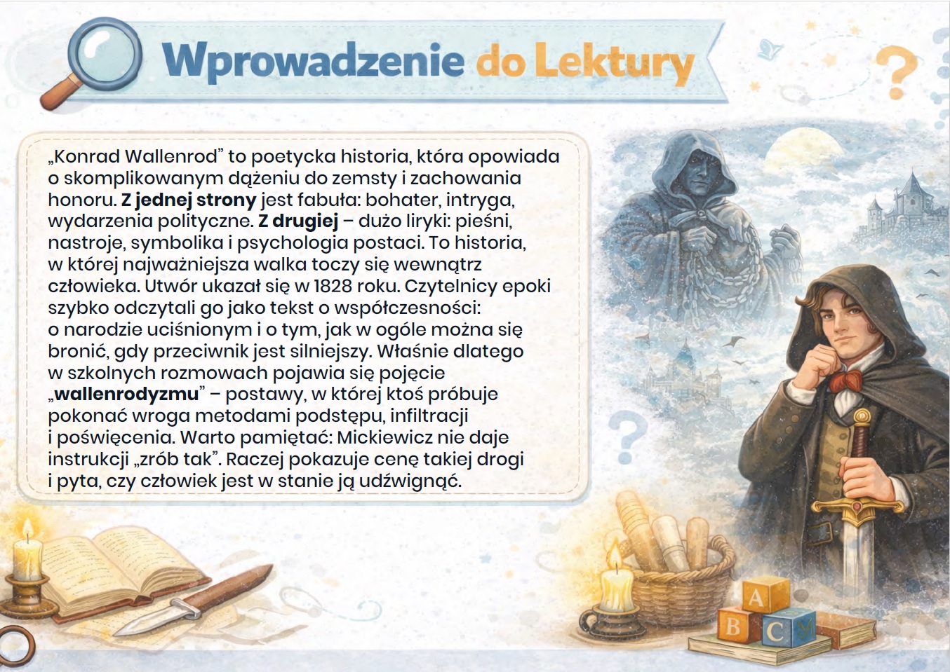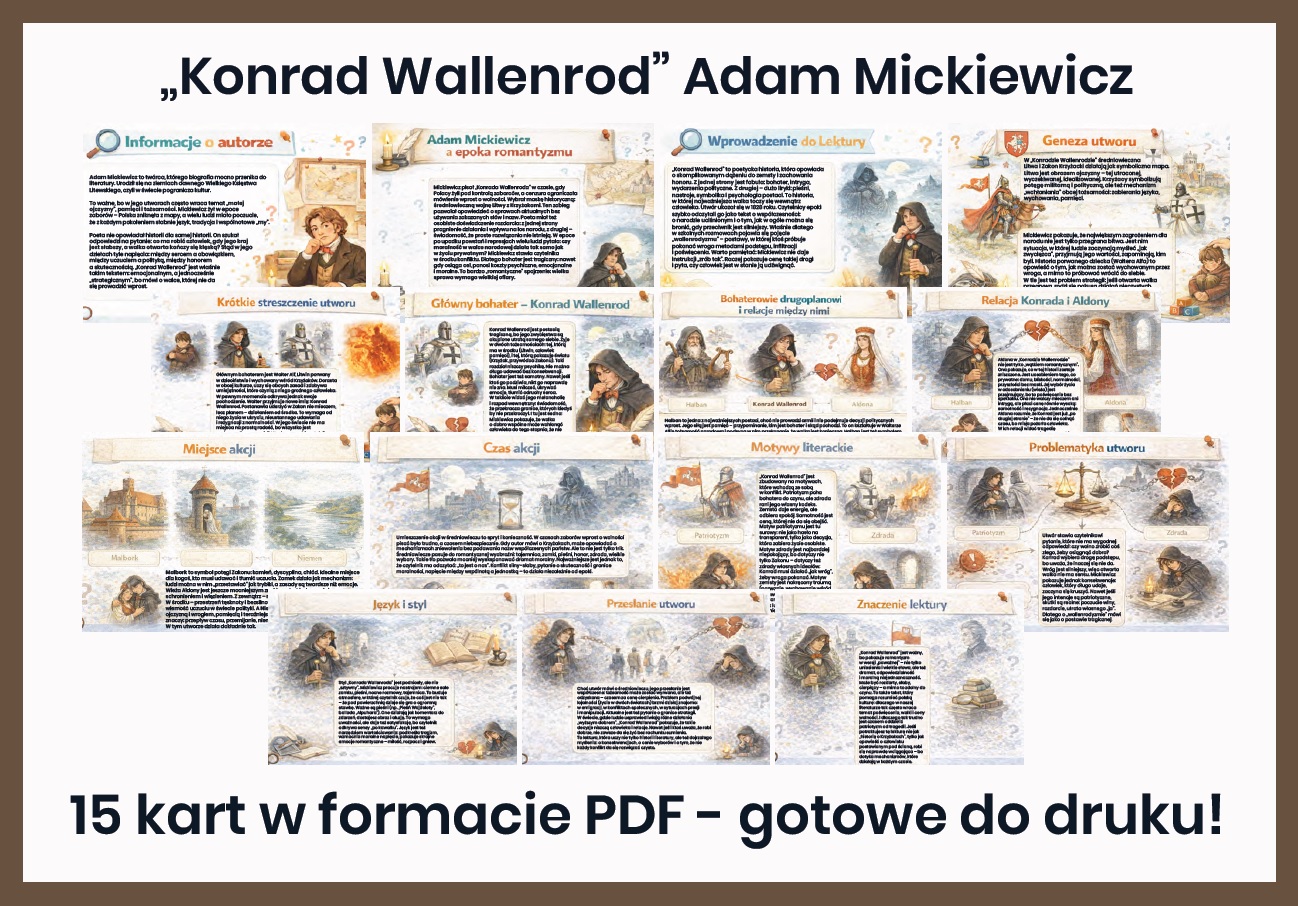 Zadbaj o czytelne i angażujące omówienie lektury „Konrad Wallenrod” w swojej klasie. Ta gazetka szkolna w formacie PDF składa się z aż 15 starannie opracowanych kart, które w przystępny sposób przybliżają treść utworu, problematykę moralną oraz postawę głównego bohatera.