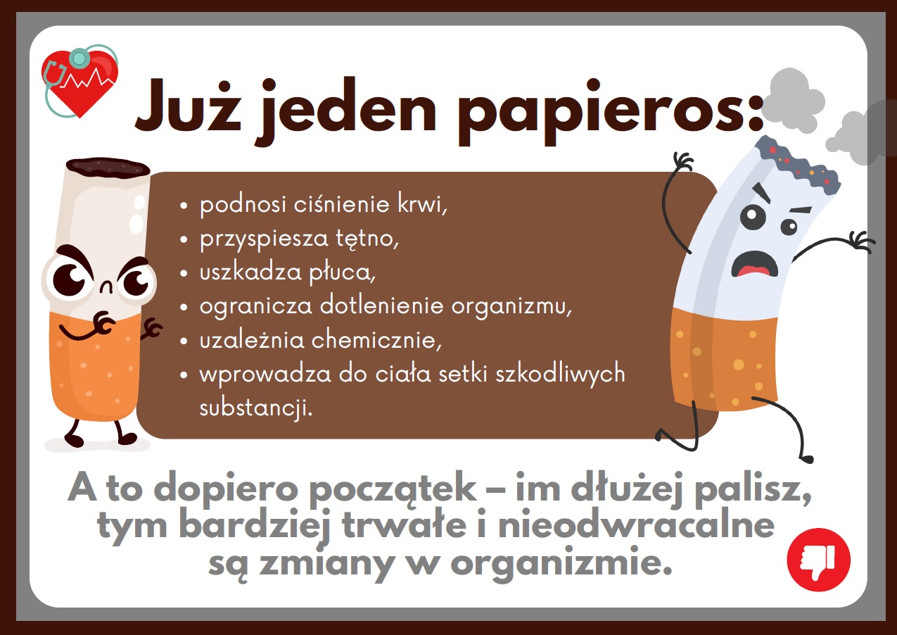 Gazetka została zbudowana tak, aby w przystępny i atrakcyjny sposób, wyjaśnić uczniom jak negatywny wpływ na zdrowie ma palenie papierosów oraz dlaczego warto unikać sięgania po wyroby tytoniowe. Gazetka zawiera ciekawostki, infografiki, hasła profilaktyczne i proste wyjaśnienia dostosowane do wieku uczniów.