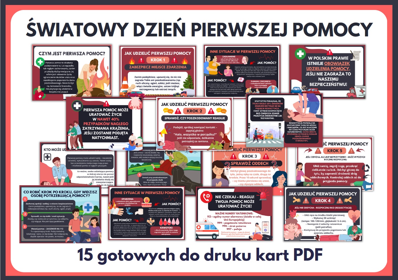 🚑👉 Przygotowałam specjalną edukacyjno-profilaktyczną gazetkę szkolną: Światowy Dzień Pierwszej Pomocy obchodzony we wrześniu. Materiał został opracowany z myślą o uczniach, aby w przystępny sposób przybliżyć im, czym jest pierwsza pomoc, dlaczego warto ją znać i jak może uratować życie.